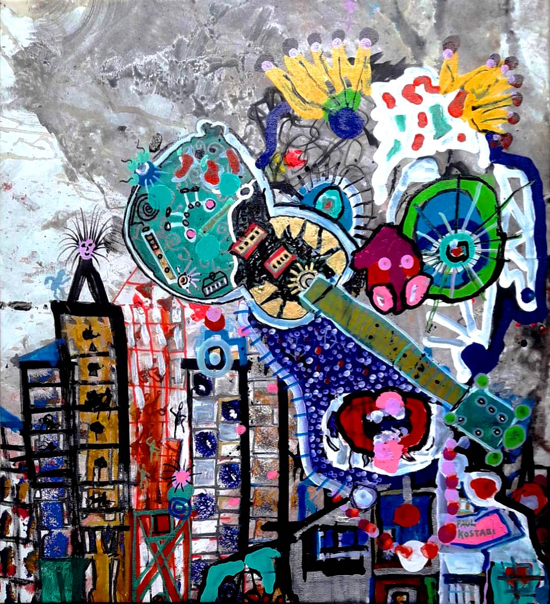 KOSTABI PAUL Whittier (CALIFORNIA) 1962 "Big city blues" Olio e tecnica mista su tela cm 75x68. Sul retro firmato ed intitolato. Certificato di garanzia ed autenticità su foto a cura della Follin Gallery e a firma dell'artista, più foto dell'artista con l'opera.