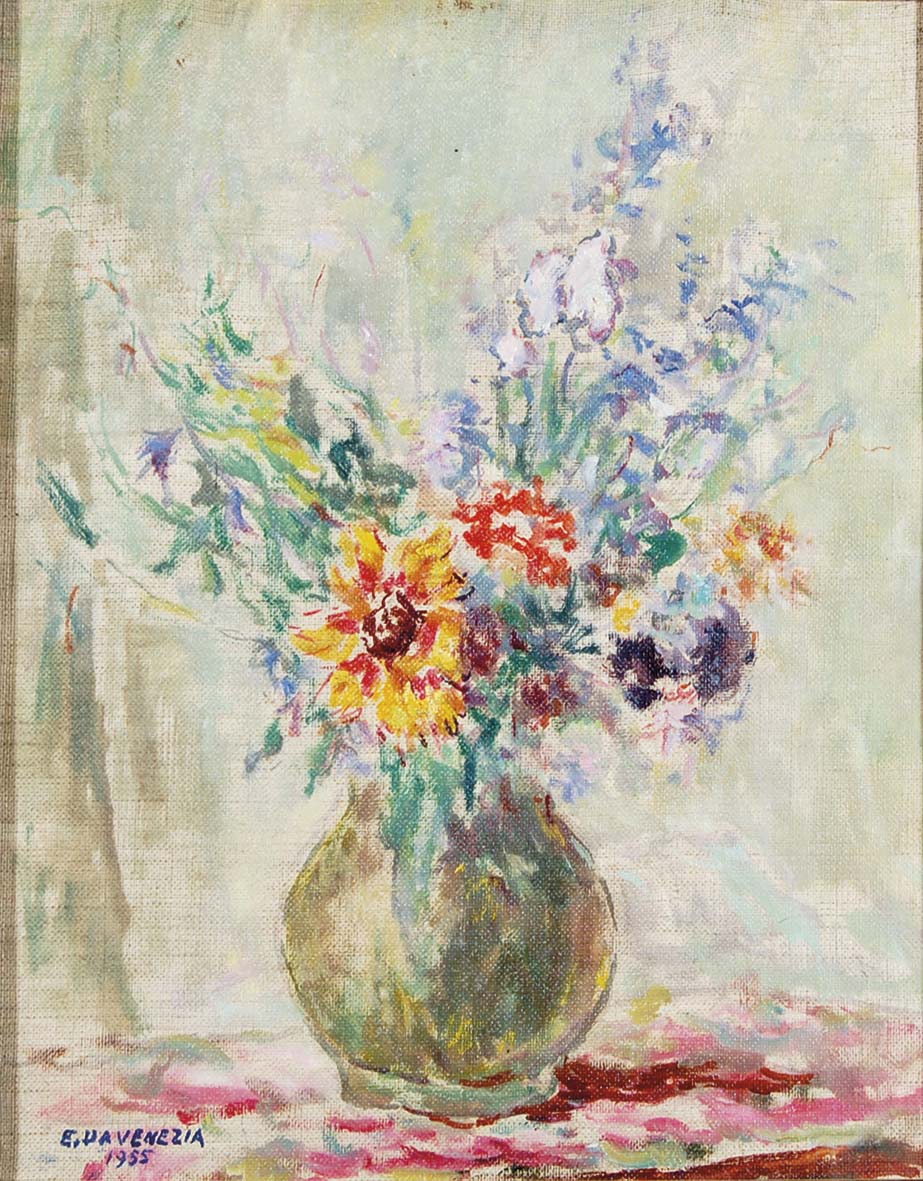DA VENEZIA EUGENIO Venezia 1900 - 1992 Zinnie e fiori vari 1955 olio su tela 50x40 firma e data in basso a sinistra e al retro