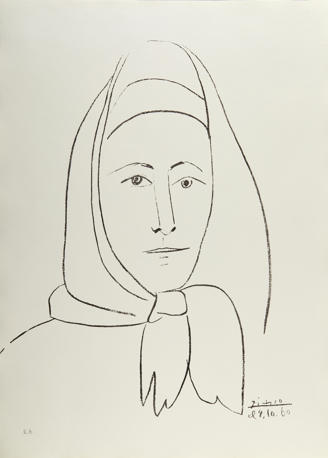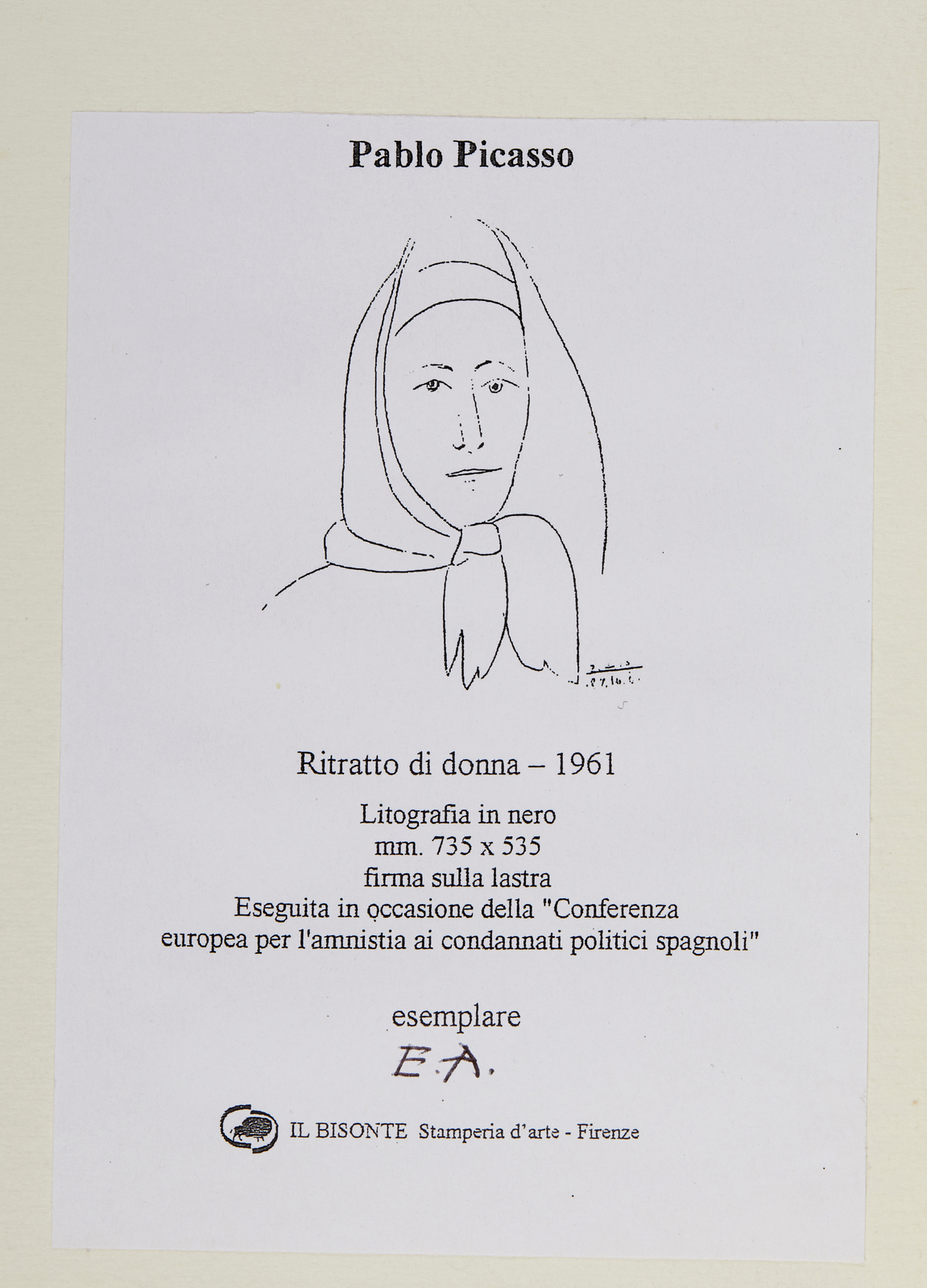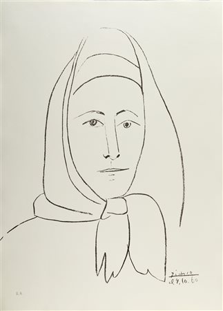 PICASSO PABLO (1881 - 1973) Femme espagnole. 1960. Litografia. . Cm 54,00 x 74,00. E.A. Firma e anno in lastra. Tiratura: 600 esemplari: 400 in numeri arabi, 100 numeri romani; 100 siglate e.a. Eseguita in occasione della "Conferenza europea per l'amnistia ai condannati politici spagnoli". Carta CM Fabriano. Pubblicazioni: Catalogue Picasso Lithographe Mourlot, Sauret edition du Livre n. 357; G. Bloch Picasso Edition de l'ouvre gravè et litographiè 1904/196 Edition Kofrnfeld, Berna 1984, Tomo I, pag. 2019 n.1009; Catalogo Il Bisonte, Firenze 1973 pag. 53 n.344. Al retro cartiglio descrittivo Ediizioni d'arte Il Bisonte, Firenze. Lievi difetti.