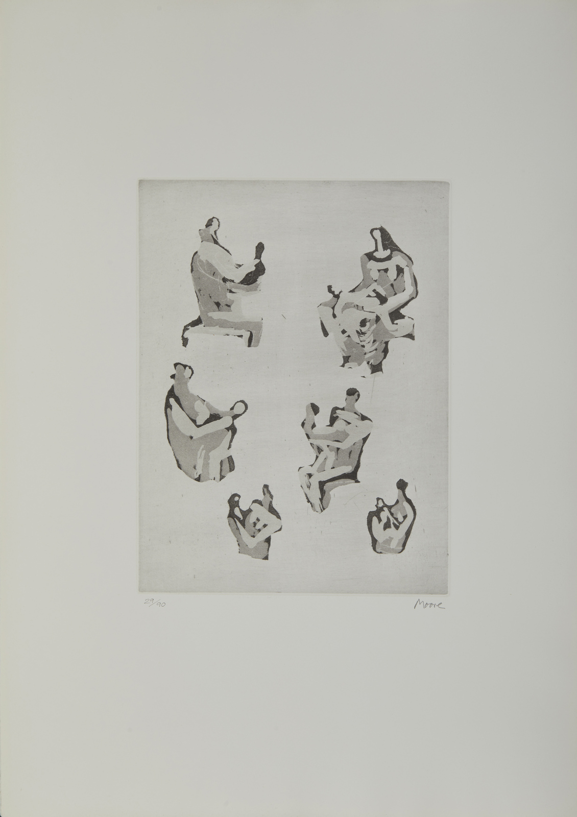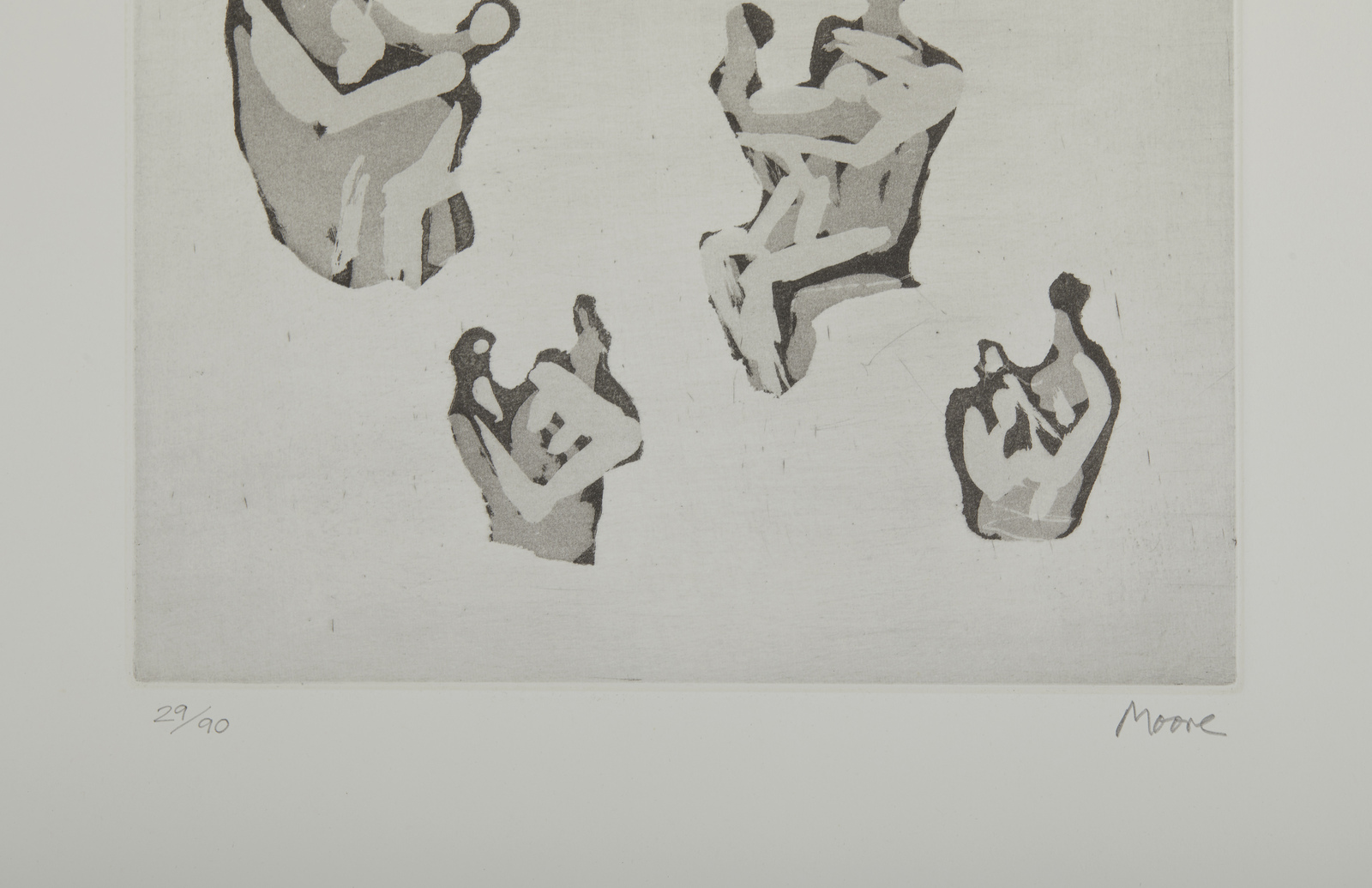 MOORE HENRY (1898 - 1986) Dalla cartella Le madri: Sei studi di madre e figlio. 1976. Acquaforte e acquatinta. Cm 46,00 x 65,00. 29/90. Tiratura e firma in basso a matita. Edizione totale: 90 esemplari. Dimensione lastra: 32.5x24 cm. Carta a mano Magnani di Pescia. La cartella è composta da 4 incisioni ( 3 a colori tirate a 100 esemplari e una in bianco e nero tirata a 90 esemplari): Sei studi di madre e figlio; figura volta verso destra; figura volta verso sinistra; quattro madri con bambino. Editore e stampatore: Il Bisonte, Firenze. Pubblicazione: Catalogo Bisonte 1983 n. 480. Cartella non completa.