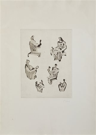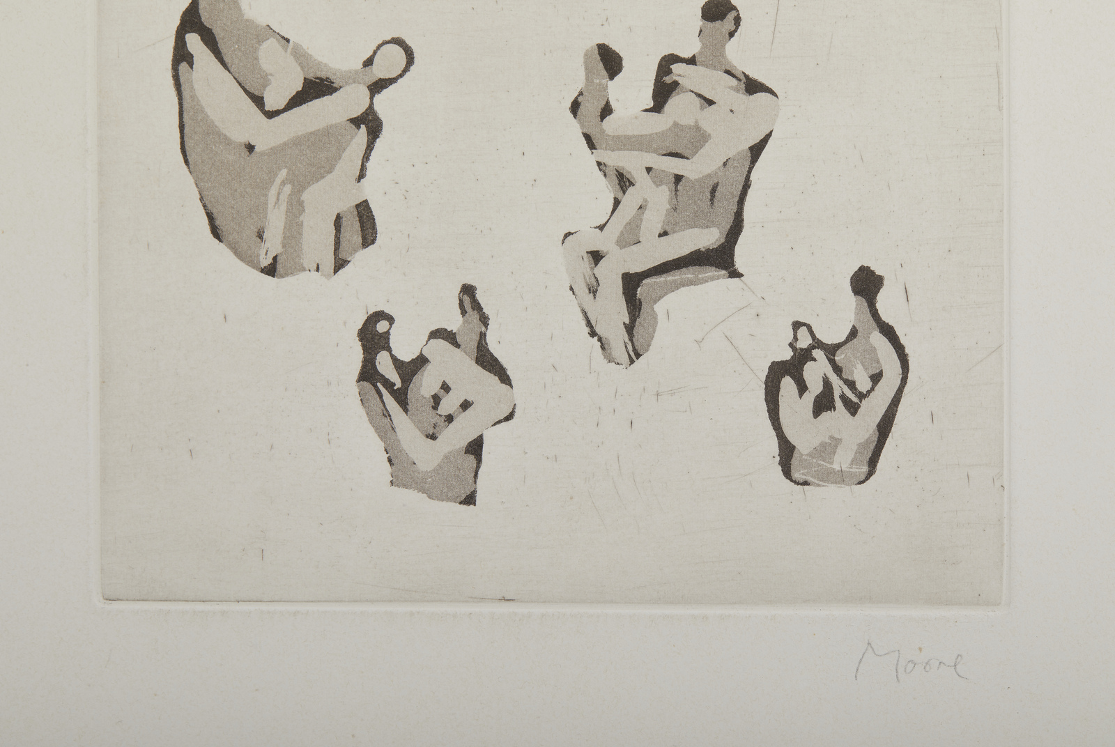 MOORE HENRY (1898 - 1986) Dalla cartella Le madri: Sei studi di madre e figlio. 1976. Acquaforte. Cm 46,50 x 64,50. La cartella è composta da 4 incisioni ( 3 a colori tirate a 100 esemplari e una in bianco e nero tirata a 90 esemplari): Sei studi di madre e figlio; figura volta verso destra; figura volta verso sinistra; quattro madri con bambino. Firma a matita in basso a destra. Dimensione lastra: 32,5x24,5cm. Editore e stampatore: Il Bisonte, Firenze. Carta a mano Magnani di Pescia.Pubblicazione: Catalogo Bisonte 1983 n. 480. Cartella non completa. Non numerata. Lievi difetti.