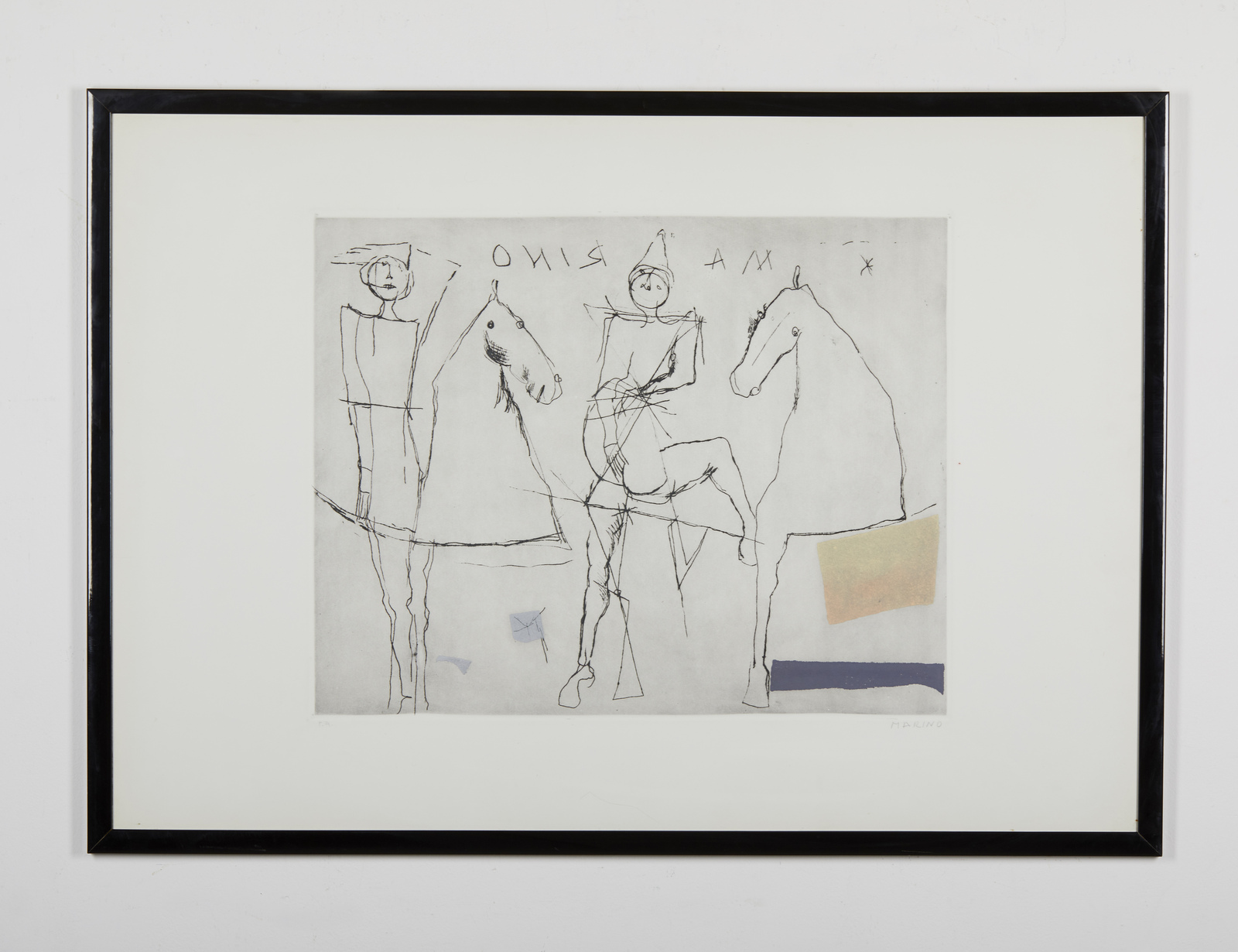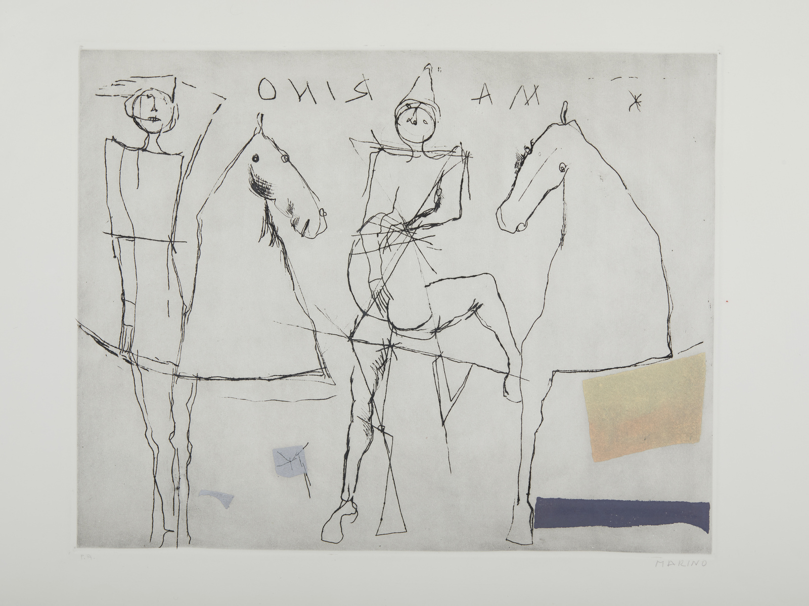 MARINI MARINO (1901 - 1980) Giocoliere sopra. Dal il Teatro delle maschere, Tav.V. 1973. Acquaforte. Cm 100,00 x 70,00. P.A Tiratura e firma in basso a matita. Dimensioni lastra: 49x62cm. Timbro a secco in basso a destra Il Cigno, Stamperia d'arte. Editore: Albra, Torino. Stampatore: Il Cigno, Roma. Edizione totale: 75 esemplari firmati e numerati da 1/75 a 75/75; 25 esemplari firmati e numerati da I/XXV a XXV/XXV +12 p.a. Pubblicazione: Marino Marini catalogo ragionato dell'opera grafica (incisioni e litografie), 1919-1980, Edizioni Graphis Arte, a cura di Giorgio e Guido Guastalla, Livorno, 1990, p.100, tav. 159. Lievi difetti. Cornice presente