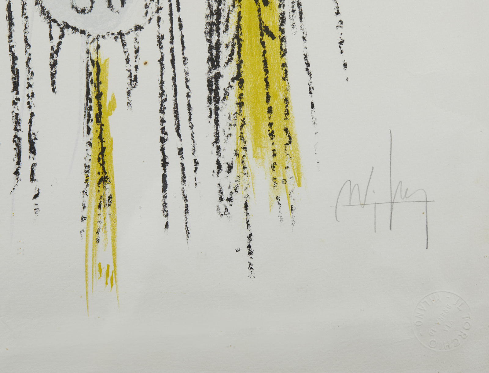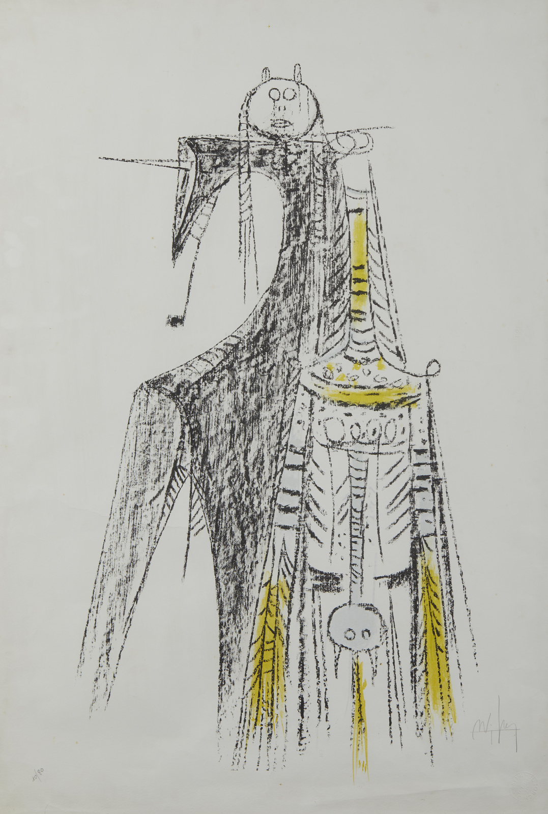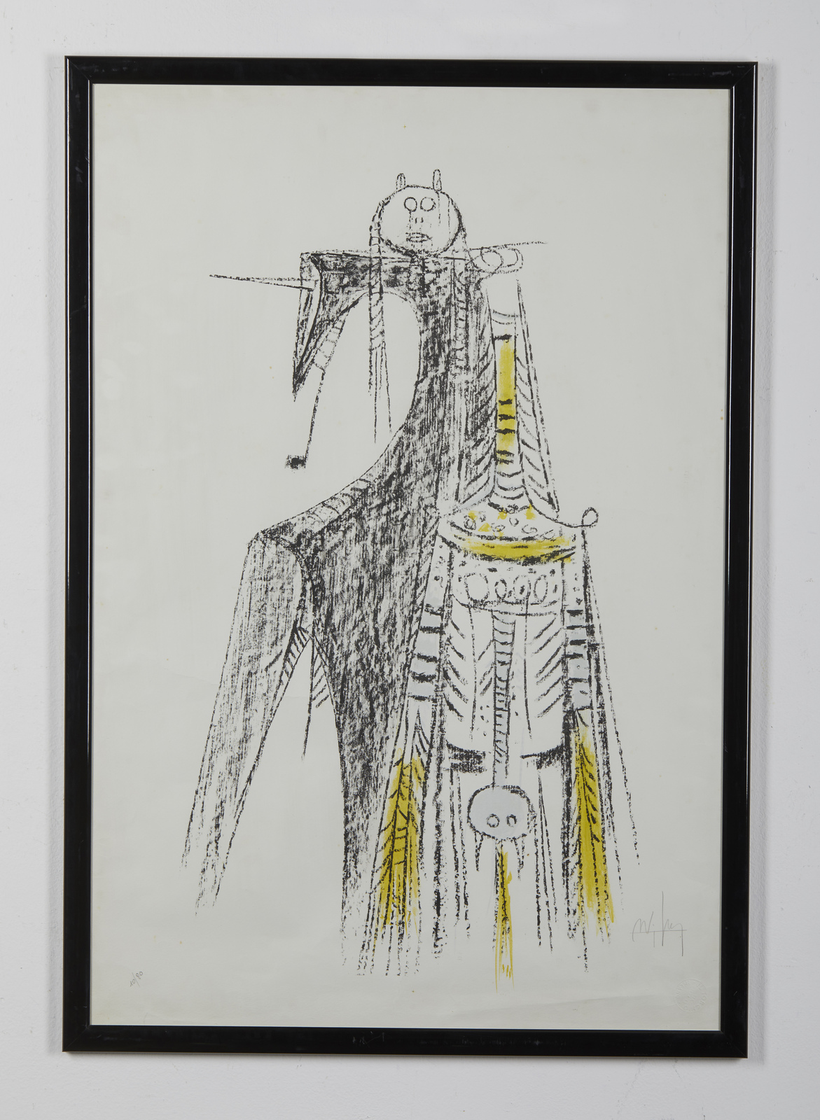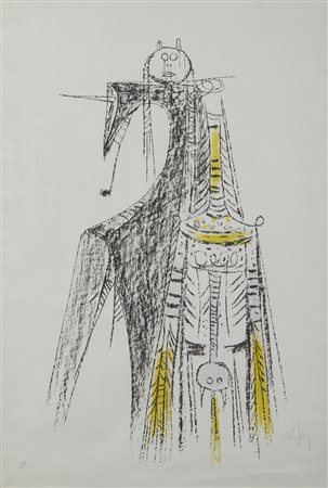 LAM WILFREDO (1902 - 1982) Totem. 1960. Serigrafia. Cm 54,00 x 79,00. 10/80. Tiratura e firma in basso a matita. Timbro a secco in basso a destra Il Torchio, Milano. Editore: Il Grattacielo. Stampatore: Il torchio, Milano. Cornice presente