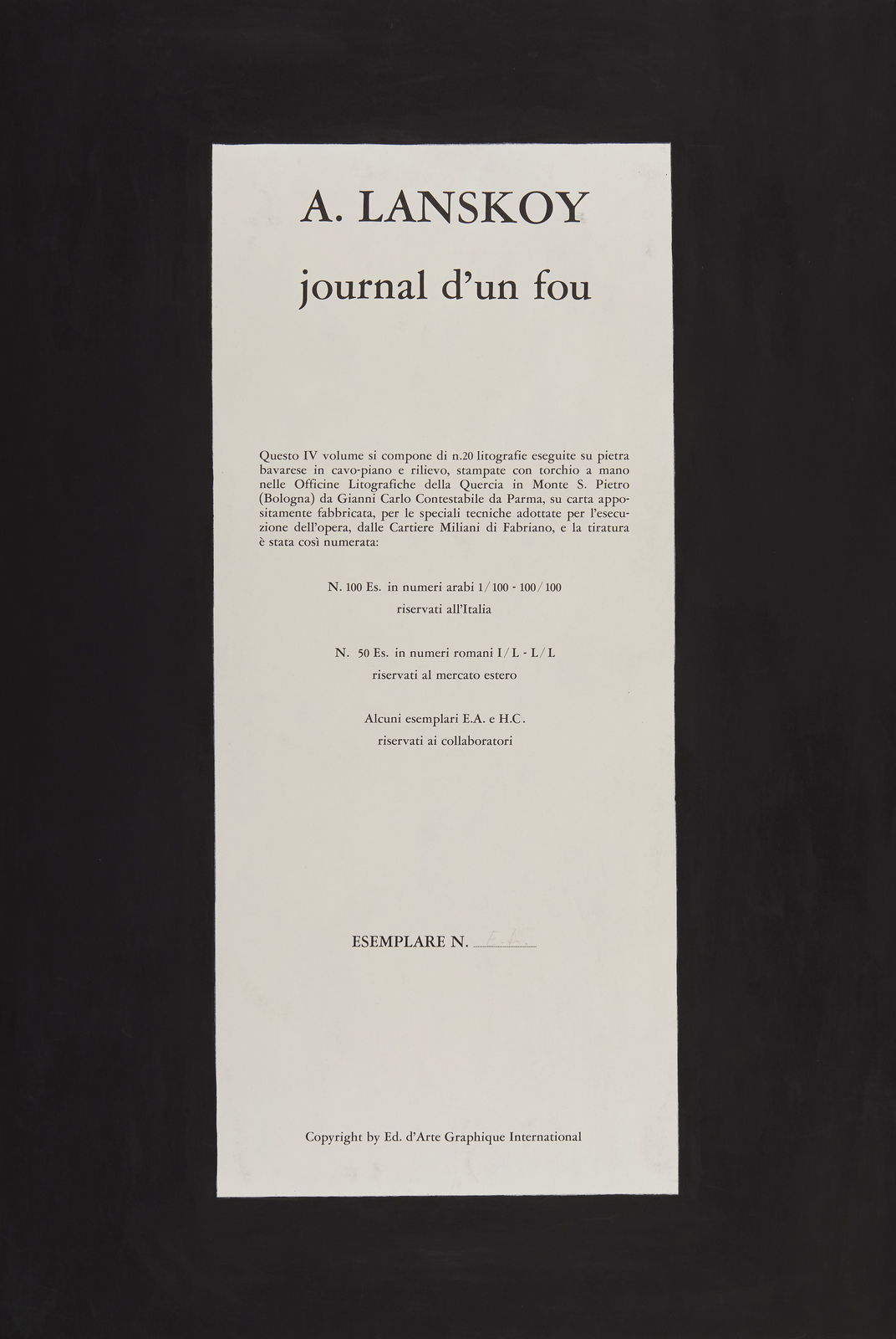 LANSKOY ANDRE' (1902 - 1976) Journal d'un Fou. 1976. Litografia (cartella completa). Cm 70,00 x 100,00. E.A. Ogni foglio presenta tiratura e firma a matita. Edizione totale: 100 + L + E.A. Editore: Edizione d'Arte Grafique International. Stampatore: Officine Litografiche della Quercia in Monte S. Pietro, Bologna. Foglio Cartiere Miliani, Fabriano.