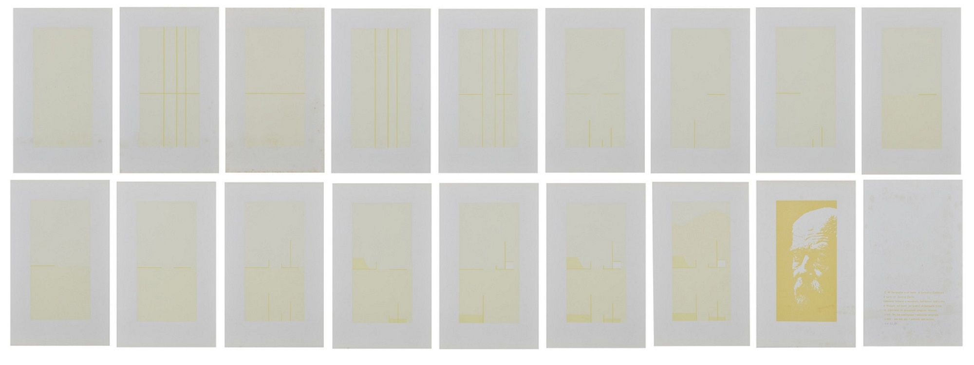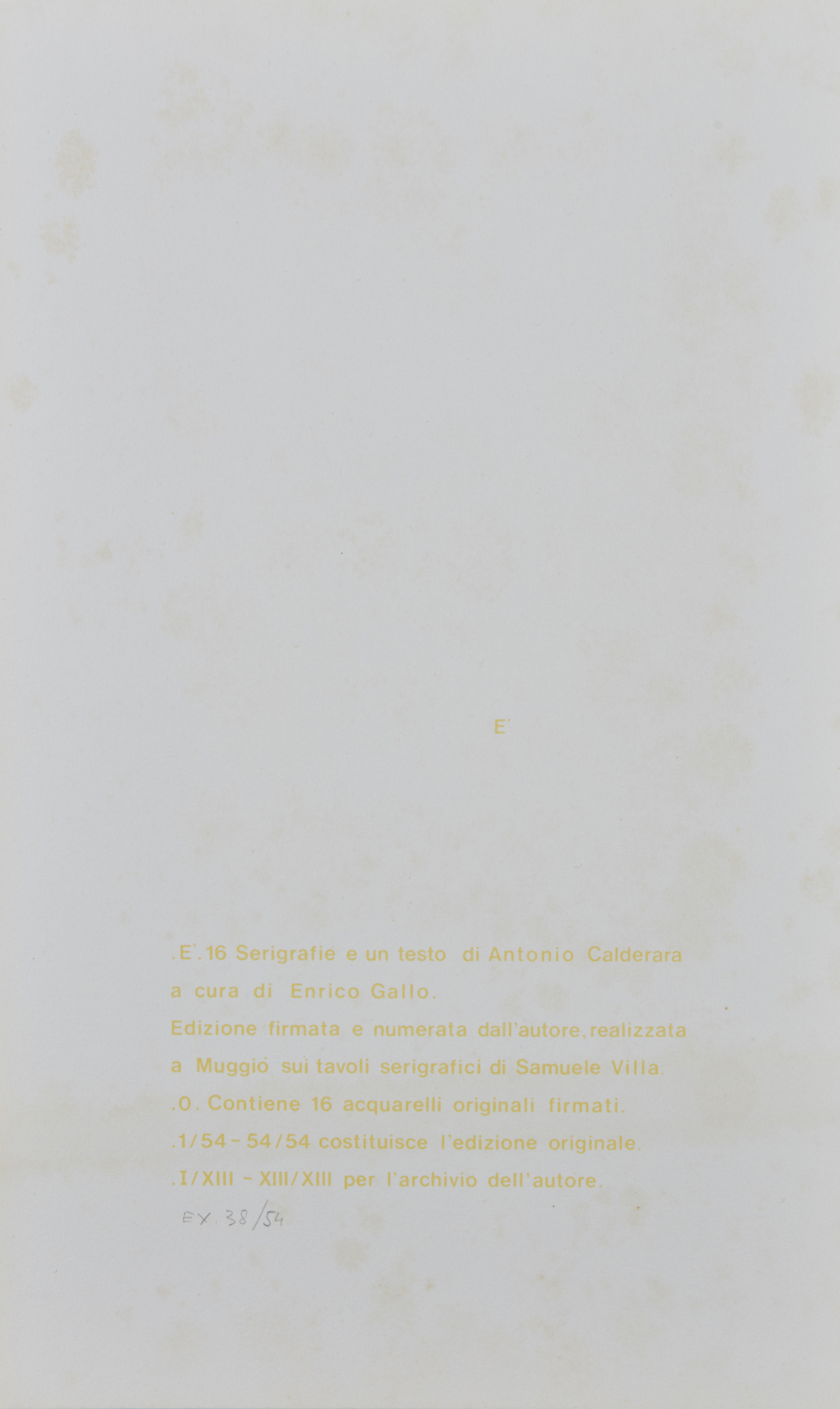 CALDERARA ANTONIO (1903 - 1978) Cartella composta da n.16 fogli. 1973. Serigrafia. Cm 23,50 x 37,50. 38/54. Al retro di ogni foglio tiratura, firma e anno.Testo e grafiche di Antonio Calderara. Stampatore: Samuele Villa, Muggio. Edizione totale: 54 esemplari numerati da 1/54 a 54/54 + XIII Esemplari per l'archivio dell'autore. Scatola originale. Difetti.