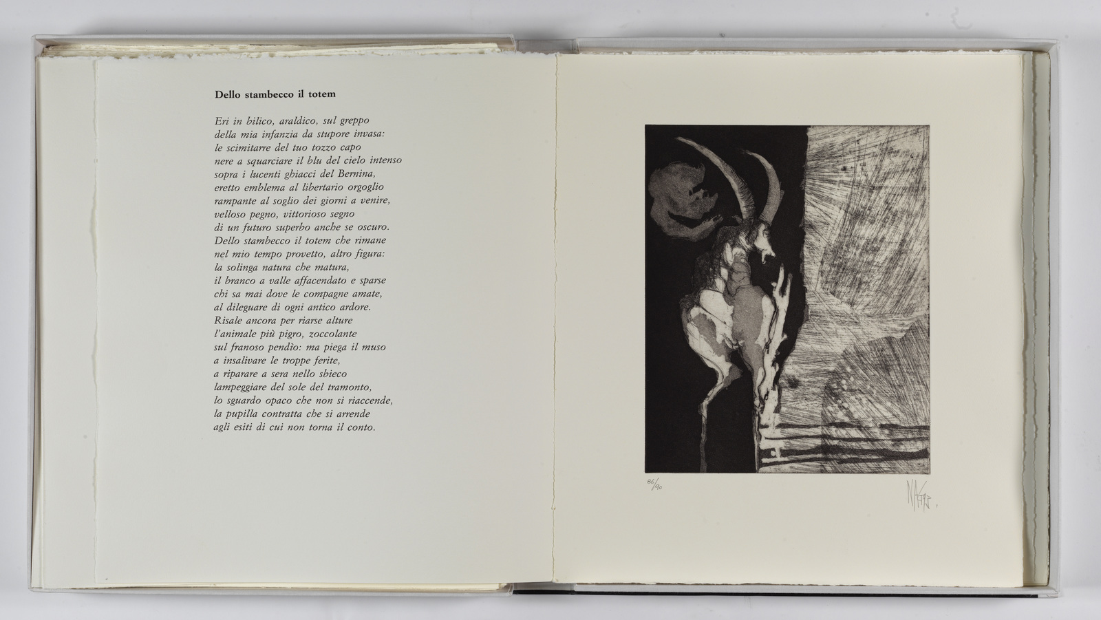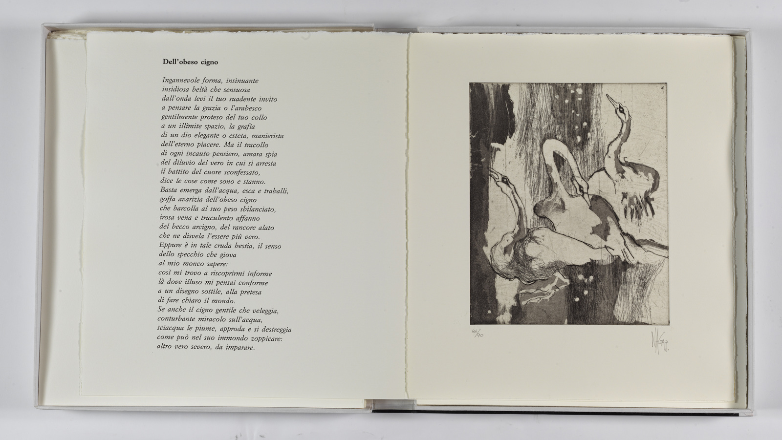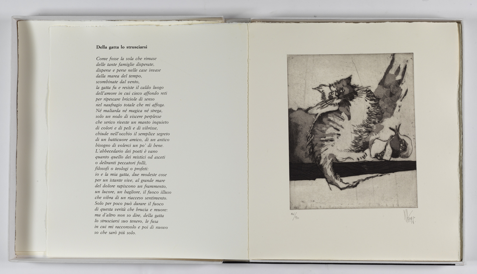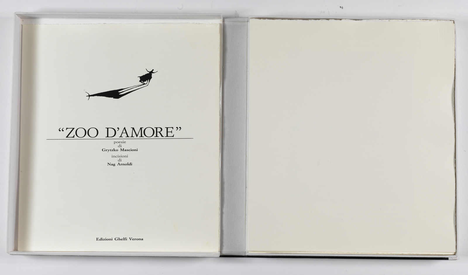 ARNOLDI NAG (n. 1928) Cartella composta da n.20 fogli. Zoo d'Amore. 1993. Acquaforte e acquatinta. Cm 40,00 x 45,00. 86/90. Tiratura e firma a matita in basso. Dimensione lastra: 29x23 cm. Stampatore: Berardinelli, Verona. Editore: Ghelfi, Verona. Carta Hahnemuhle. Presente confezione originale.
