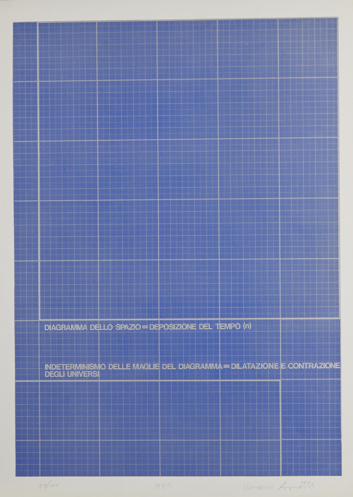 AGNETTI VINCENZO (1926 - 1981) Diagramma dello spazio = deposizione del tempo (n). . 1970. Litografia. Cm 50,00 x 70,00. 50/100. Tiratura, firma e anno in basso a matita. Timbro a secco Exempla edizioni d'arte, Firenze. in basso a sinistra. Certificato di autenticità rilasciato da Oltrearte, Treviso. Edizione totale: 100 esemplari.