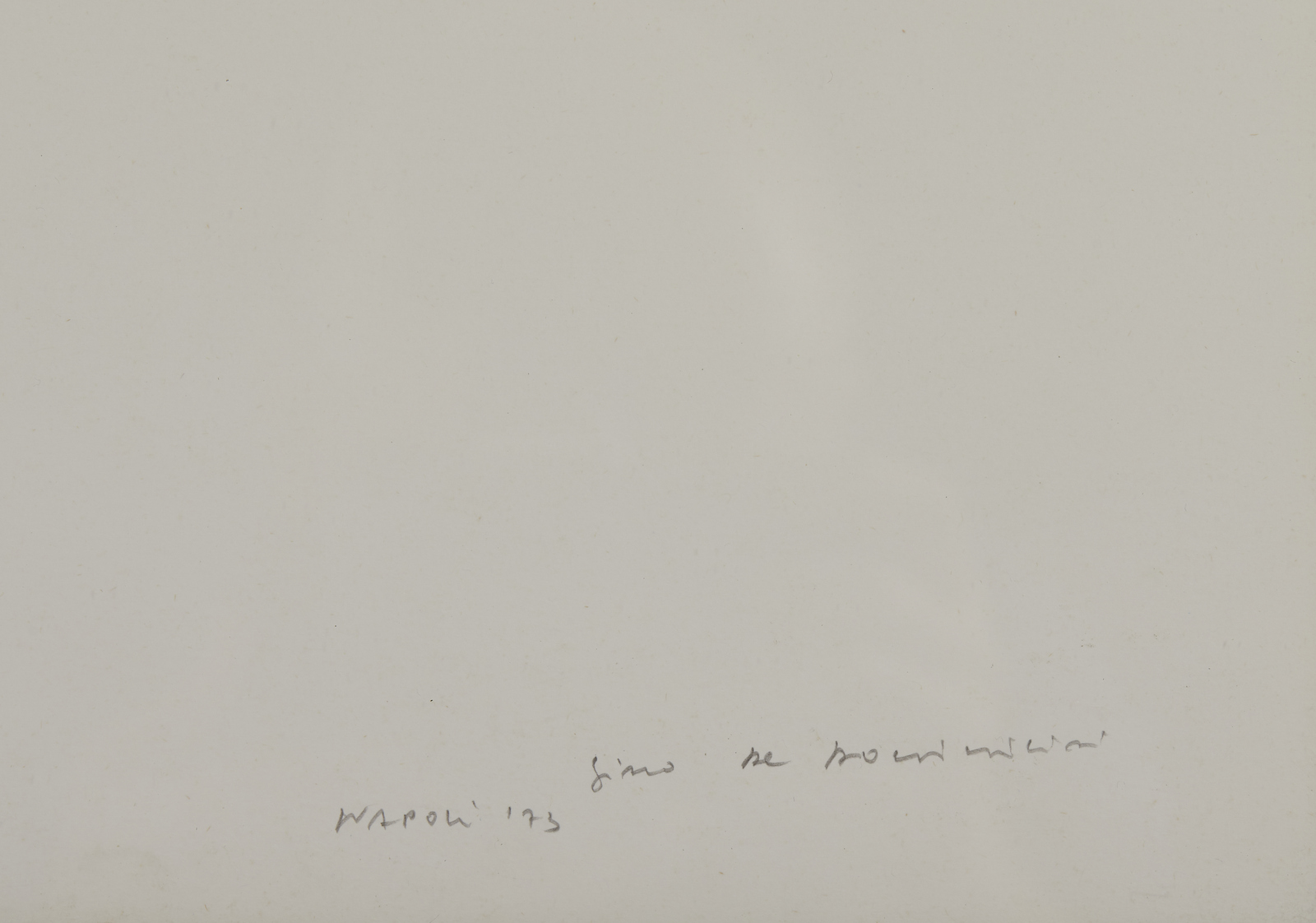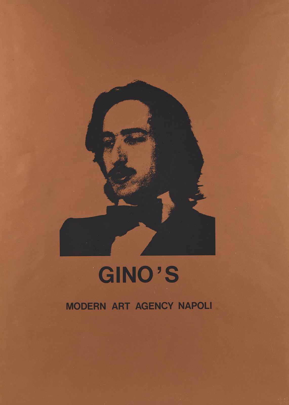 DE DOMINICIS GINO (1947 - 1998) Gino's Modern Art Agency Napoli. 1973. Serigrafia su cartone. Cm 49,50 x 69,00. Pezzo unico. Al retro firma e anno. Provenienza: Collezione Lucio Amelio, Napoli; Galleria Pio Monti, Roma; Collezione privata, Riccione. Prototipo realizzato per la stampa di una serie di magliette che avrebbe dovuto produrre Lucio Amelio per la Modern Art Agency, Napoli e che poi non fù più realizzata. Lievi difetti. Cornice presente