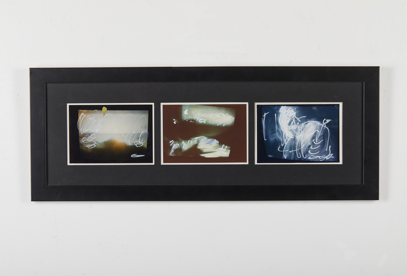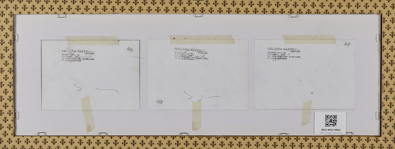 SCHIFANO MARIO (1934 - 1998) Senza titolo. Intervento su fotografia. Cm 61,00 x 20,50. Lotto composto da n.3 fotografie. Al retro, ogni fotografia, presenta la firma e il timbro della Galleria Mazzoli, Modena. Dimensione singola foto: 11.5x17 cm. Ringraziamo la Galleria Mazzoli, Modena, per aver confermato la provenienza. . Cornice presente