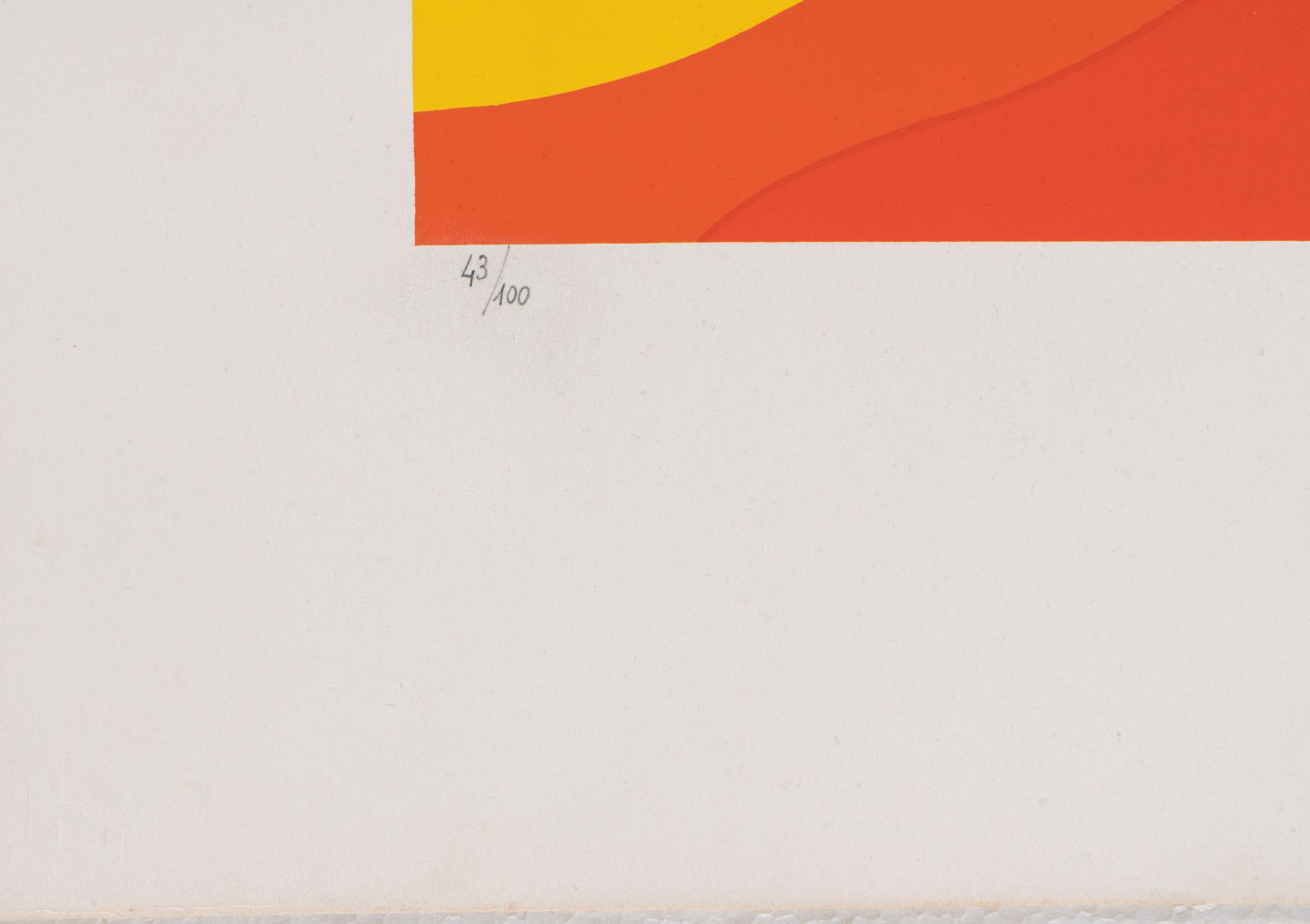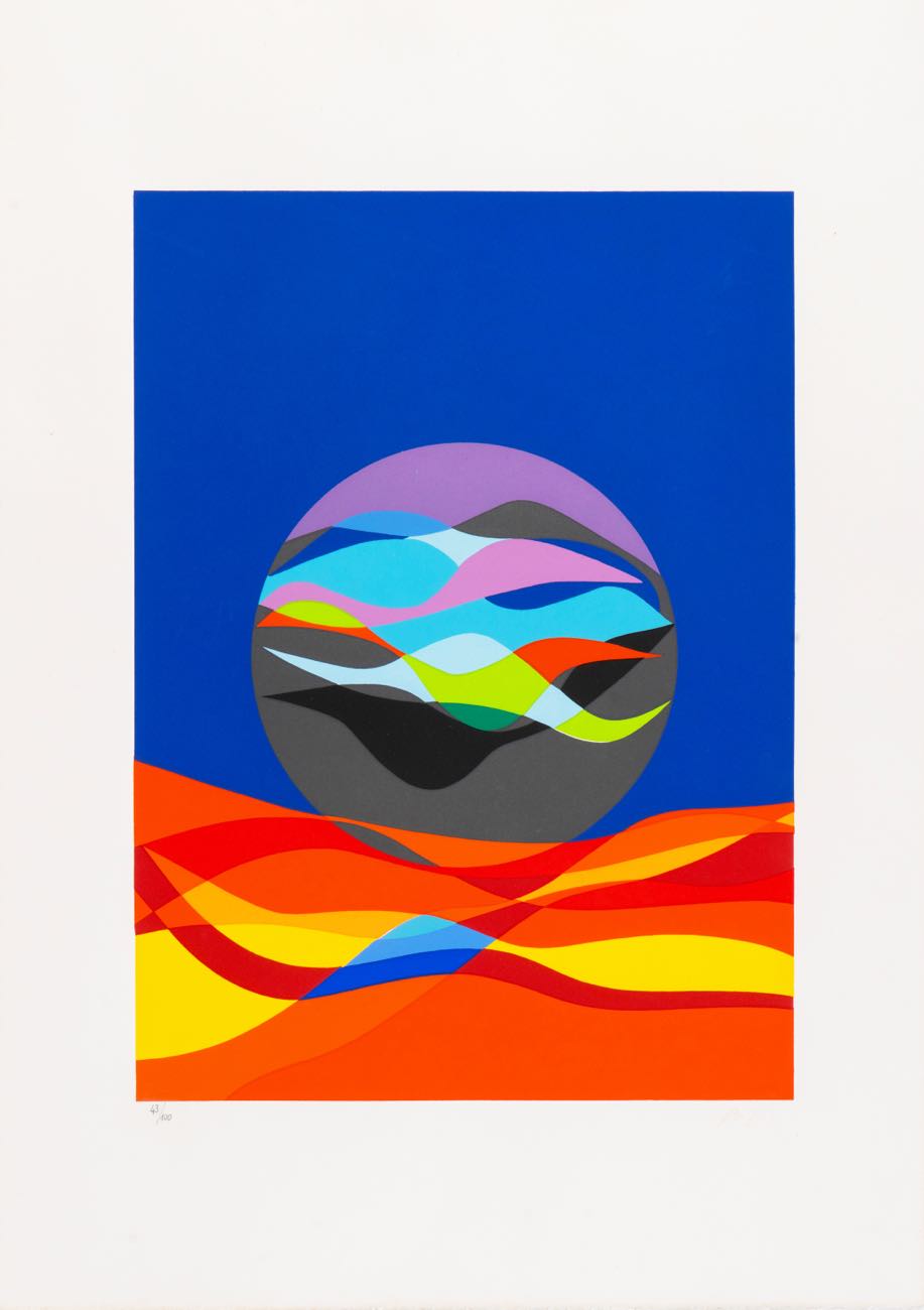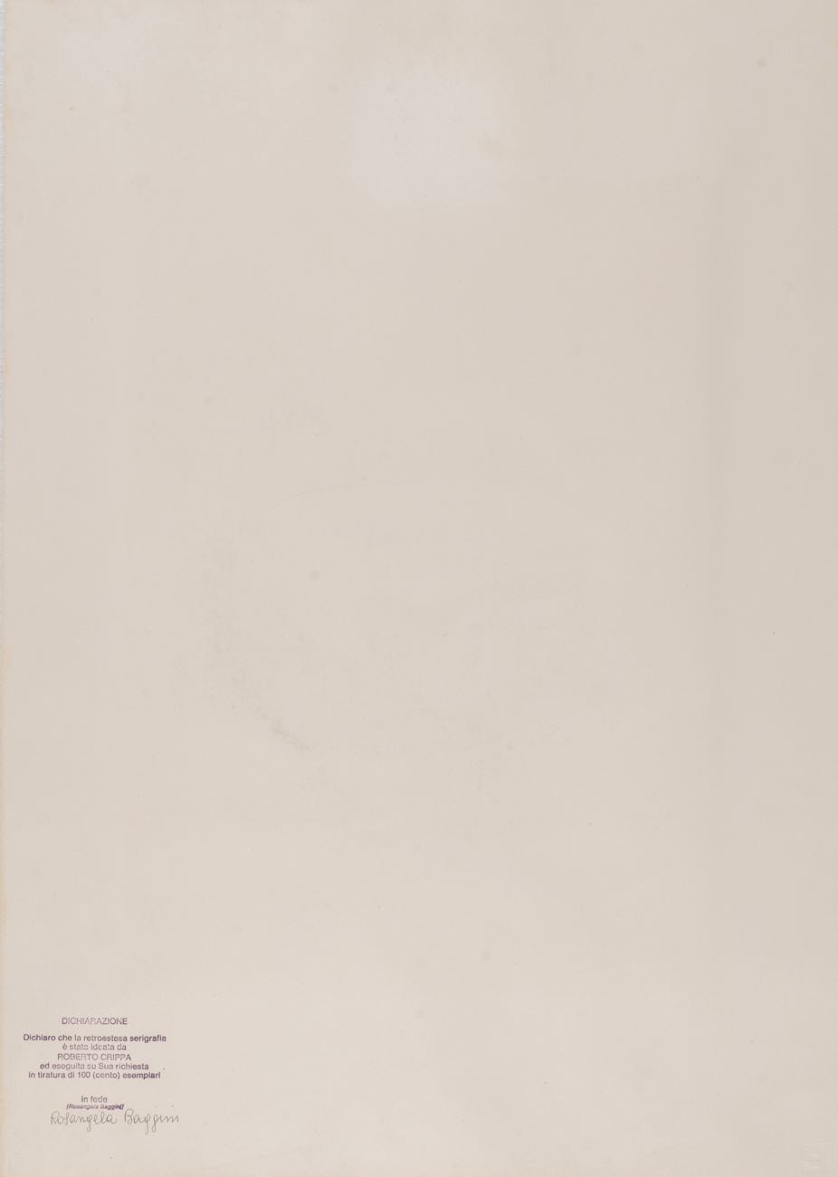 Litografia a colori su carta, firmata in basso destra, numero di tiratura in basso a sinistra 43/100, reca al retro iscrizione per dichiarazione di autenticità a firma Rosangela Baggini, Foglio H cm 70x50