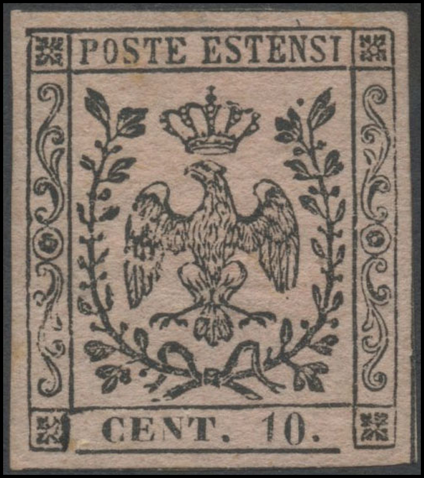 Previous Lot 44 Next Bertolami Fine Art - Piazza Lovatelli 1, 00186 Roma FILATELIA ASTA WEB 239: FILATELIA Thursday 10 November 2022 hours 14:00 (UTC +01:00) Modena, 1852, 10c. N.9 Pink, MH. (A) (Sorani) Modena, 1852, 10c. N.9 Pink, MH. (A) (Sorani)