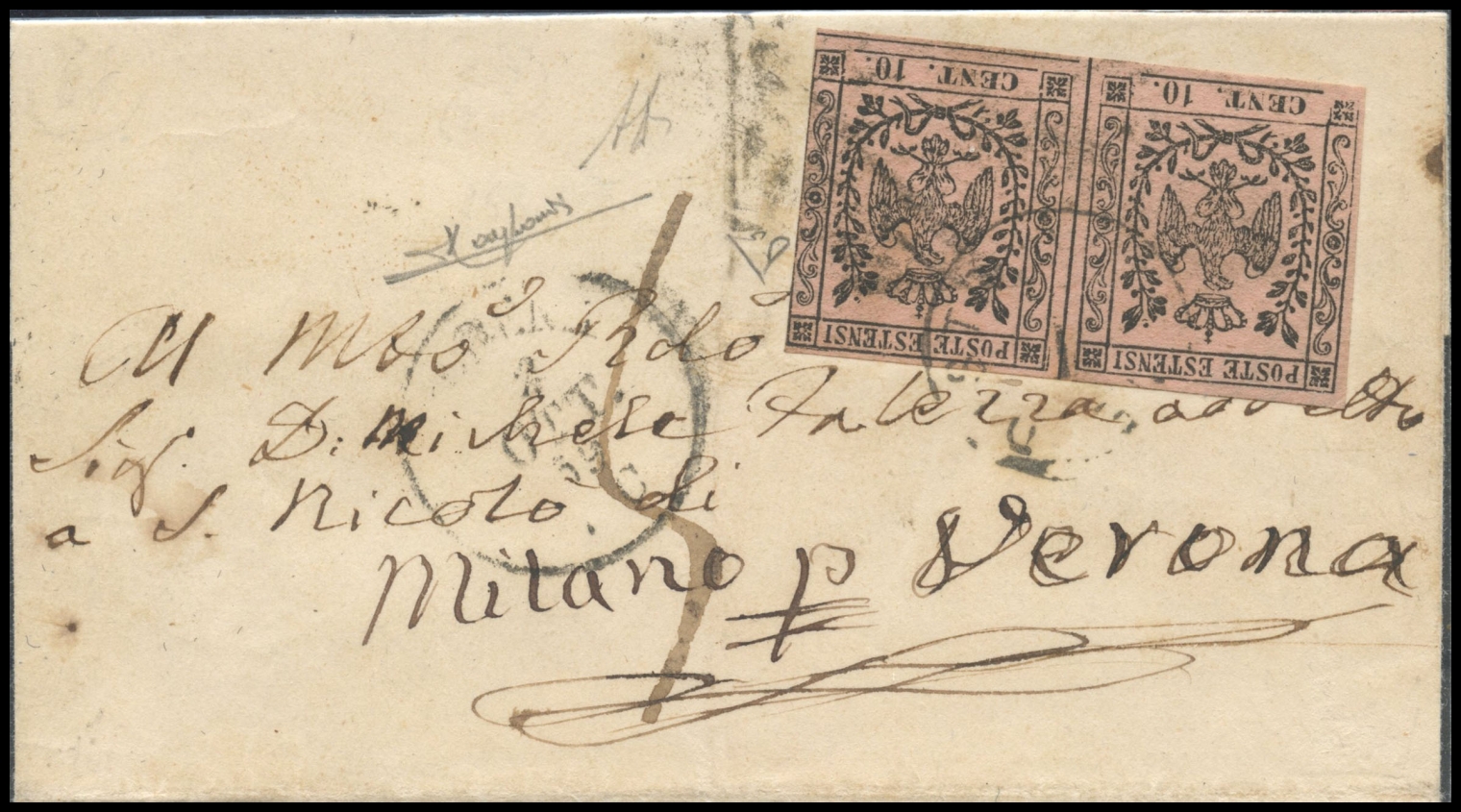 Modena, 02.10.1859, Letter from Modena to Verona posted with a pair of 10c....