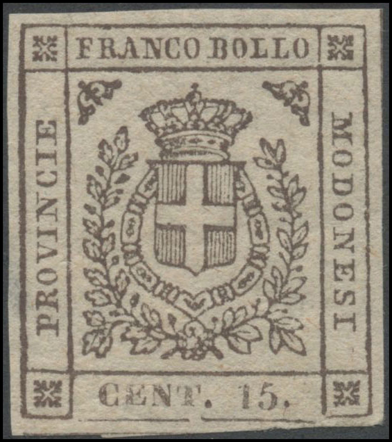 Previous Lot 47 Next Bertolami Fine Art - Piazza Lovatelli 1, 00186 Roma FILATELIA ASTA WEB 239: FILATELIA Thursday 10 November 2022 hours 14:00 (UTC +01:00) Modena, 1859, 15c. N.13 Brown, MH. (A+) (Cert. Sorani) Modena, 1859, 15c. N.13 Brown, MH. (A+) (Cert. Sorani)