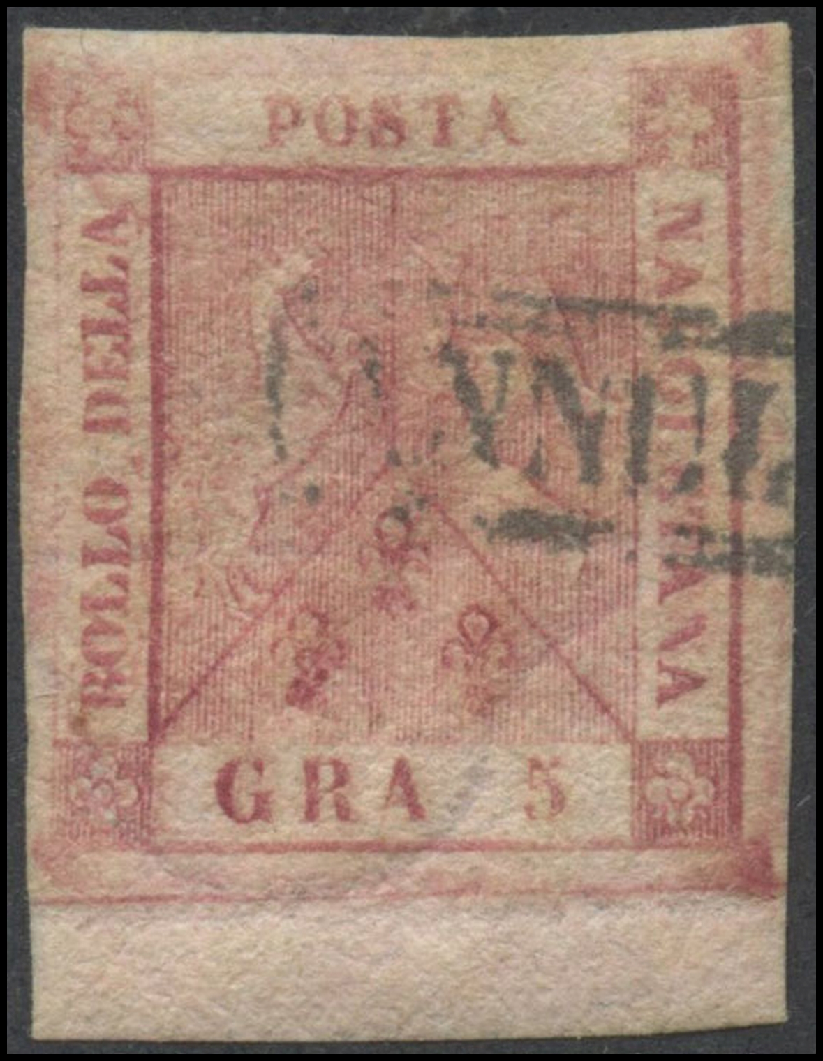 Naples, 1858, 5gr. N.9 Carmine Pink featuring a rather interesting watermark on the lowermost margin. (Lux)