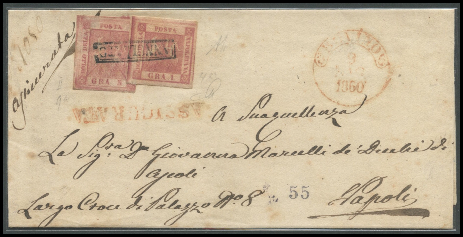 Naples, 9.5.1860, Registered letter from Bovino to Napoli posted with a 6gr. (double fee compared to an ordinary letter), on the letter's stamp duty a red "ASSICURATA" (insured) is present. (Lux) (A.Diena, Vaccari)