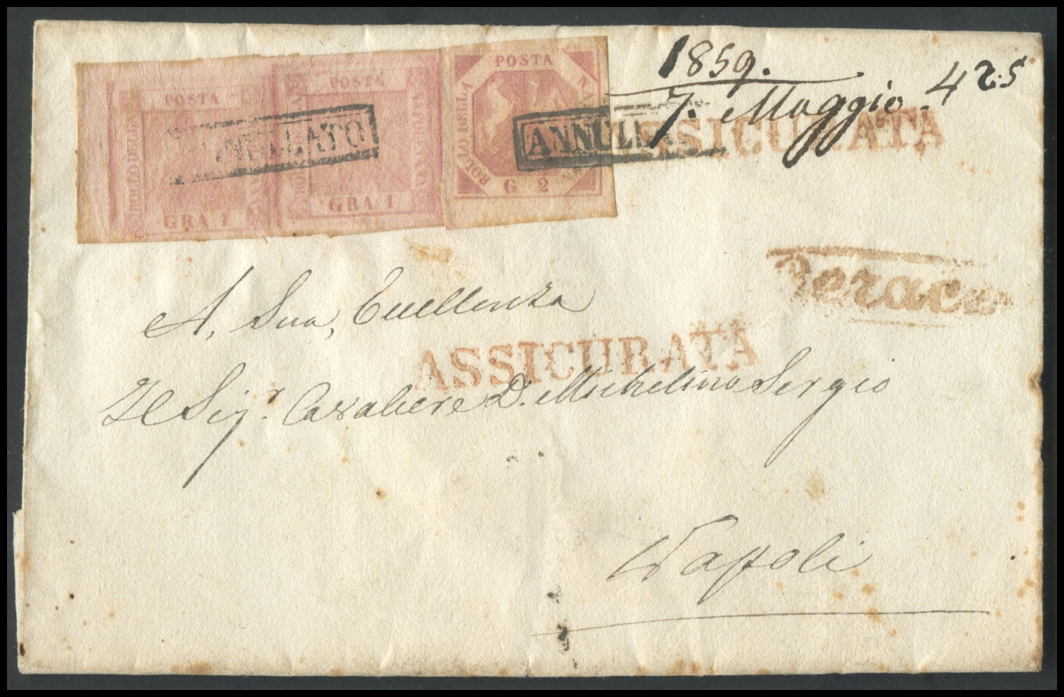 Naples, 07.05.1859, Letter from Gerace to Naples posted with a 4gr. using the following couple: 1gr. Violet Pink (heavily misaligned and featuring the sheet margin on the left) N.3a and a 2gr. Tawnish Pink N.7. A double imprint is present on the front: "ASSICURATA" (insured) in red block letters; the front also features Gerace's oval and the "ANNULLATO" (cancelled) historic franking mark in black. (A+)