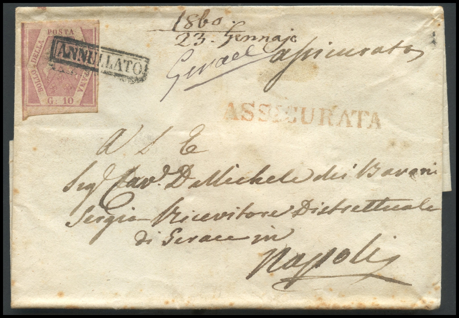 Naples, 23.01.1860, Letter from Gerace to Naples posted with a 10gr. Puplish Pink N.10a. The letter was cancelled using a historic franking mark "ANNULLATO" (cancelled). Oddly enough, "GERACE" was handwritten and not postmarked in the classic oval or red circle. (A+)