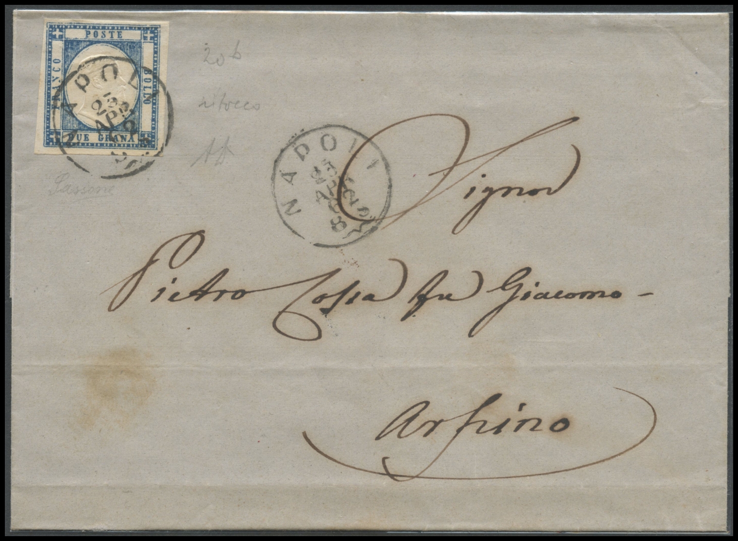 Neapolitan Provinces, 23.04.62, Letter from Naples to Arpino posted with a 2gr. The item belongs to the "tavola dei 100 ritocchi". The stamps preserved on the letters are particularly worthy of interest. (Lux) (Sassone, A. Diena)
