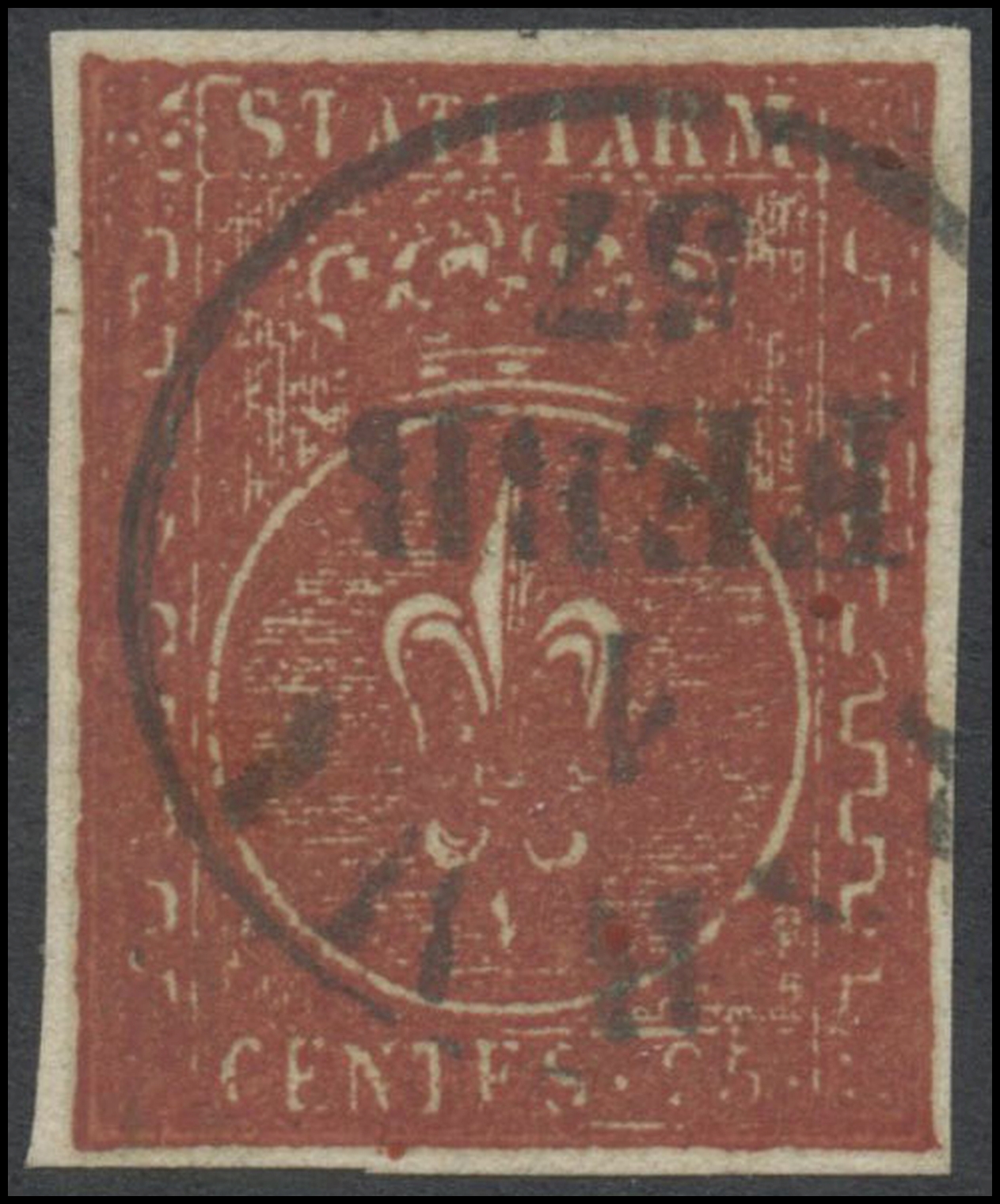 Previous Lot 83 Next Bertolami Fine Art - Piazza Lovatelli 1, 00186 Roma FILATELIA ASTA WEB 239: FILATELIA Thursday 10 November 2022 hours 14:00 (UTC +01:00) Parma, 1853, 25c. N.8 Tawny Red, used. (Lux) Parma, 1853, 25c. N.8 Tawny Red, used. (Lux)