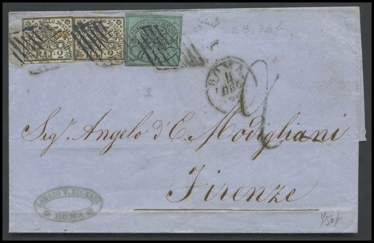 Papal States, 4.12.1863, Letter from Rome to Florence posted with 5Baj. using value of 1Baj. N.2B dark green and two valuables of 2Baj. N.3Aa greenish white. (A) (Chiavarello)