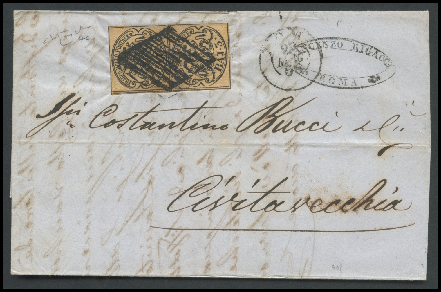 Papal States, 21.05.1856, Letter from Rome to Civitavecchia posted with 68Baj. using a couple of 3Baj. N.4c suede. (Lux) (Raybaudi)