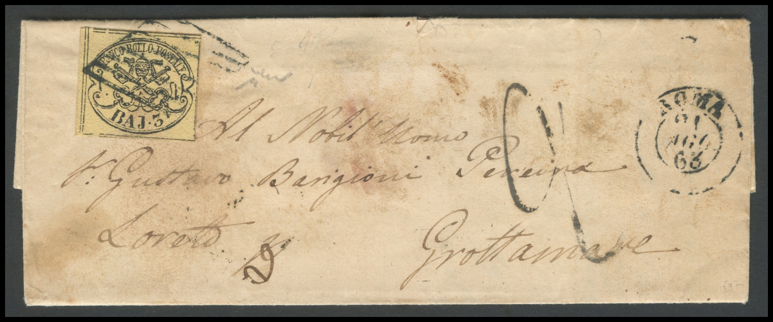Papal States, 21.08.1863, Letter from Rome to Grottammare posted with 3Baj. N.4A Chromed yellow. (A+) (Cert. Chiavarello)