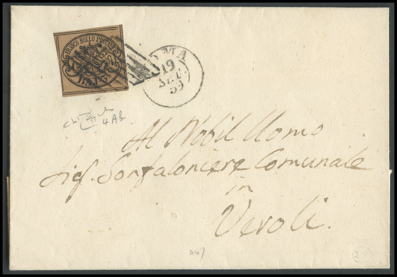 Lot 95 | Papal States, 19.09.1859, Letter from Rome to Veroli posted with 3Baj. N.4Ab...