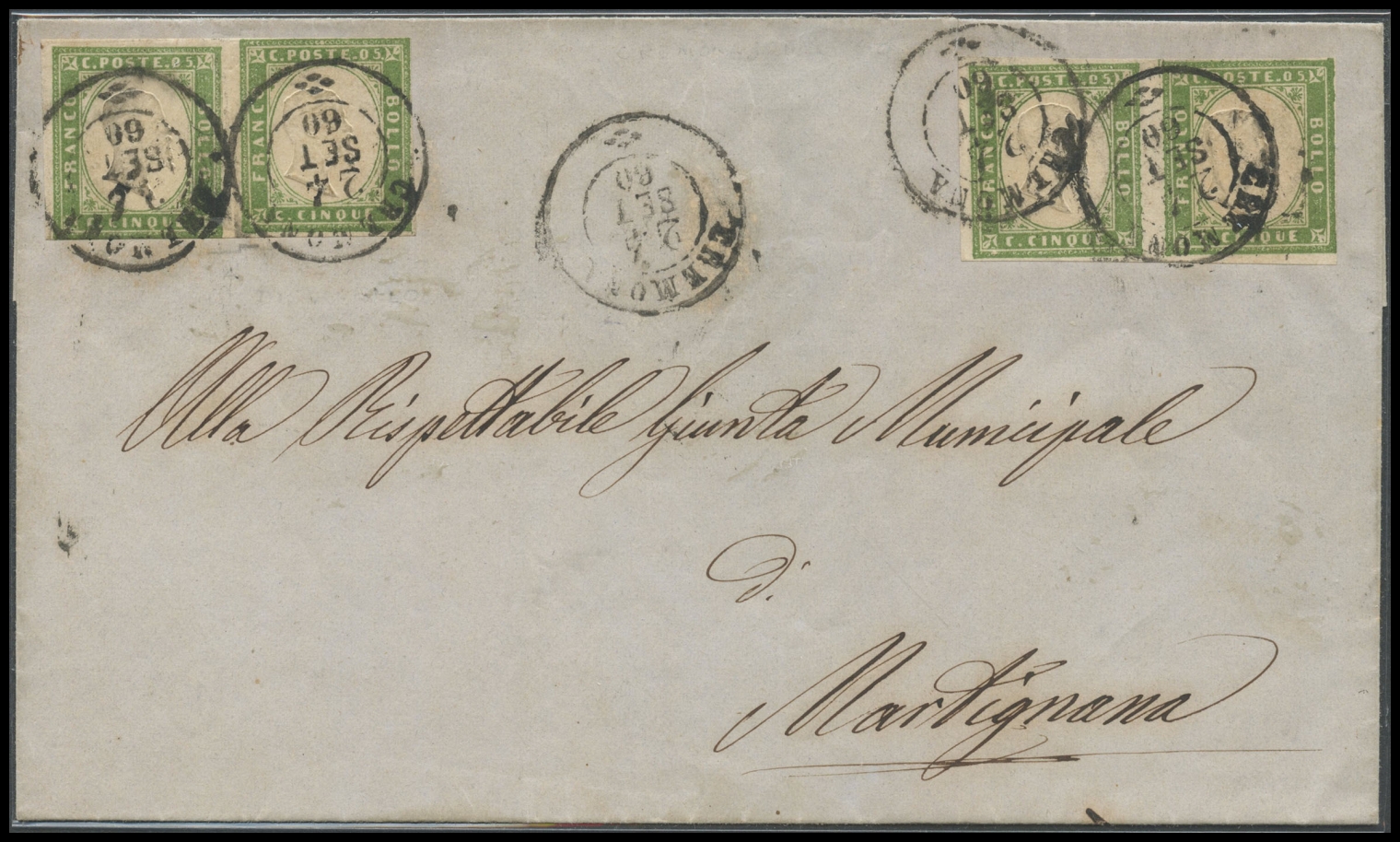 Sardinia, 24.09.1860, Letter from Cremona to Martignana posted through a 20c via two couples of 5c. N,13Bc Olive Green. Margins in good condition, one of the stamps is lightly touched on the lowermost side. (A/A-)