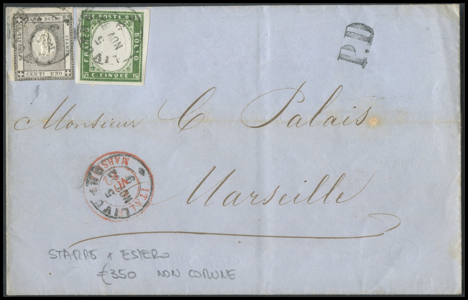 Sardinia, 05.11.1862, Letter from Livorno to Marseille posted with a 6c. (fee for printed material) using a 1c. destined for prints and a 5c. Dark green 13D.