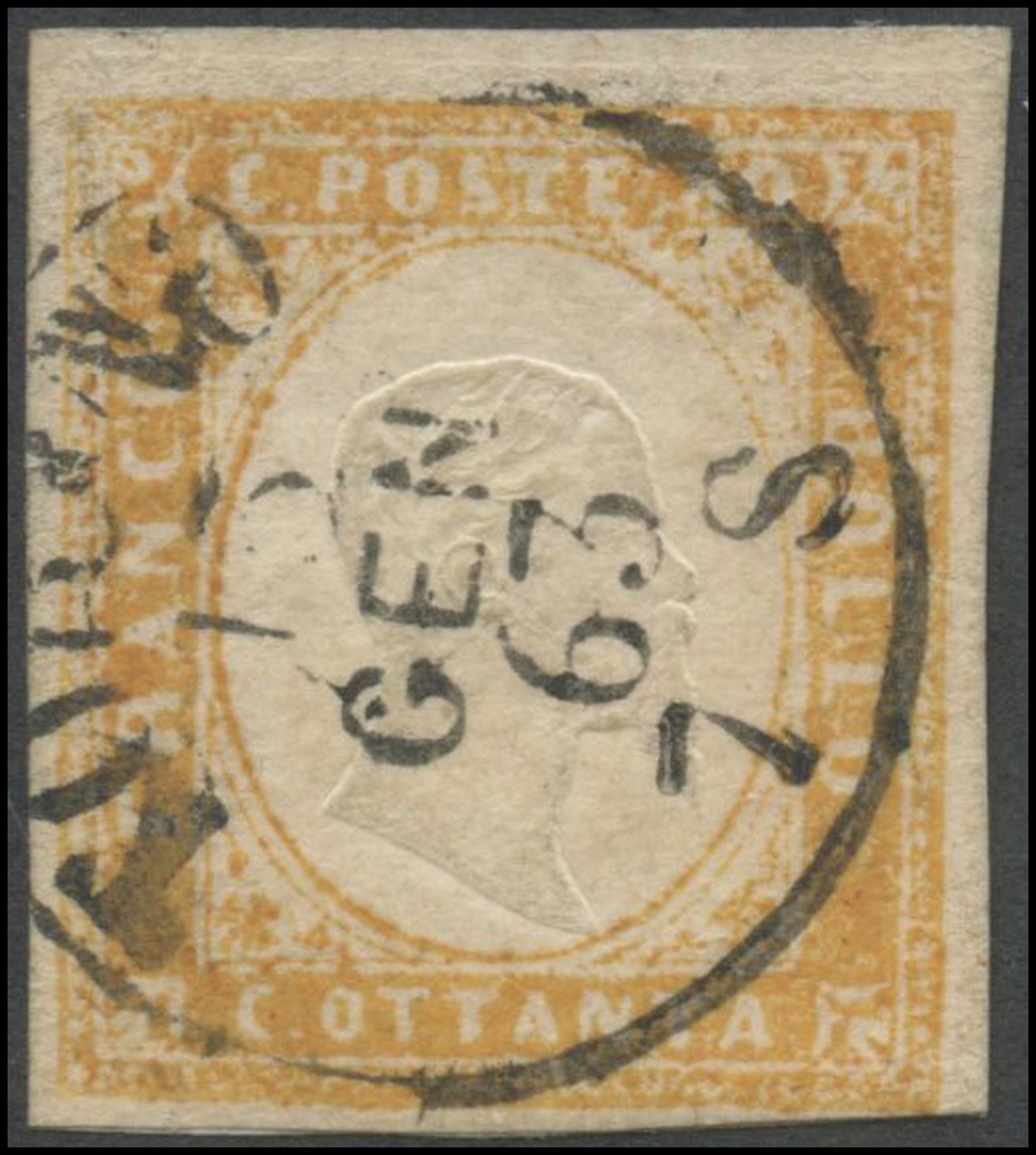Sardinia, 13.01.1863, 80c. N.17b Ochre Pale Orange, used very late in Turin. Margins in excellent condition, the lowermost one shrinks towards the right up until the corner. (A)