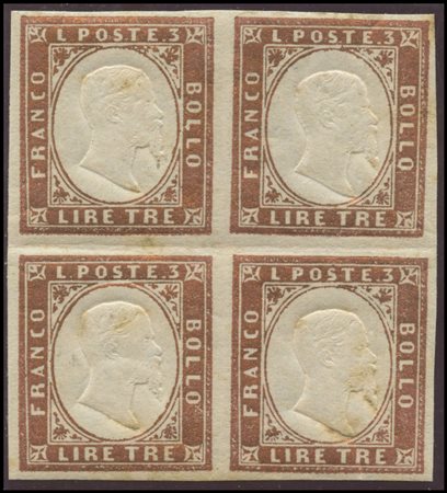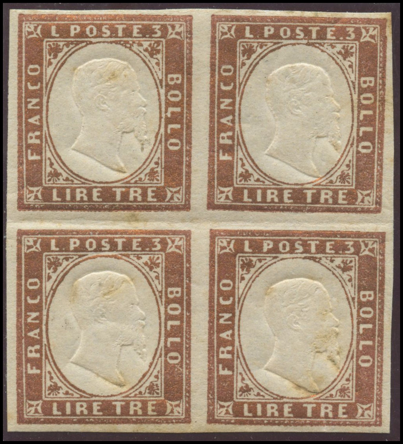 Sardinia, 1861, 3L. N.18 Copper. The two upper stamps are hinged, the lower ones are gummed. Some rusty blemishes, but no hidden flaw. (B)