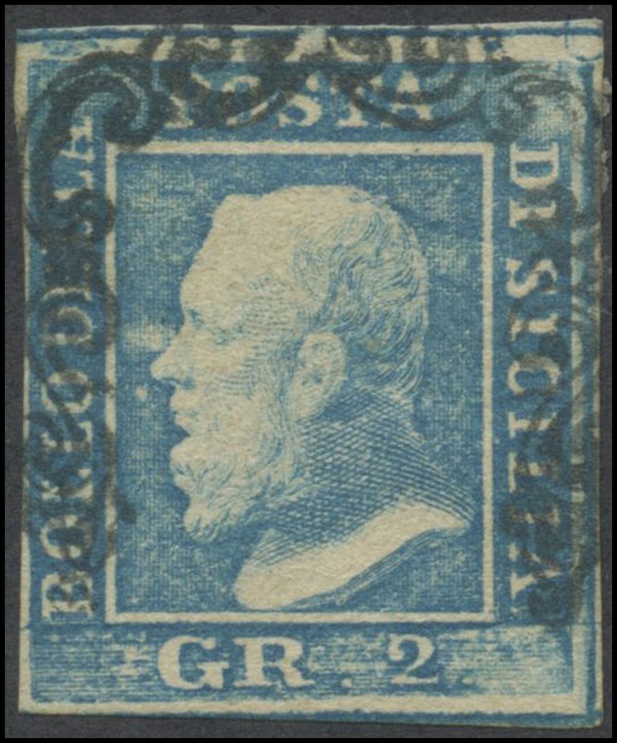 Previous Lot 157 Next Bertolami Fine Art - Piazza Lovatelli 1, 00186 Roma FILATELIA ASTA WEB 239: FILATELIA Thursday 10 November 2022 hours 14:00 (UTC +01:00) Sicily, 1859, 2gr. light blue N.6g, used (A+) (Sorani) Sicily, 1859, 2gr. light blue N.6g, used (A+) (Sorani)