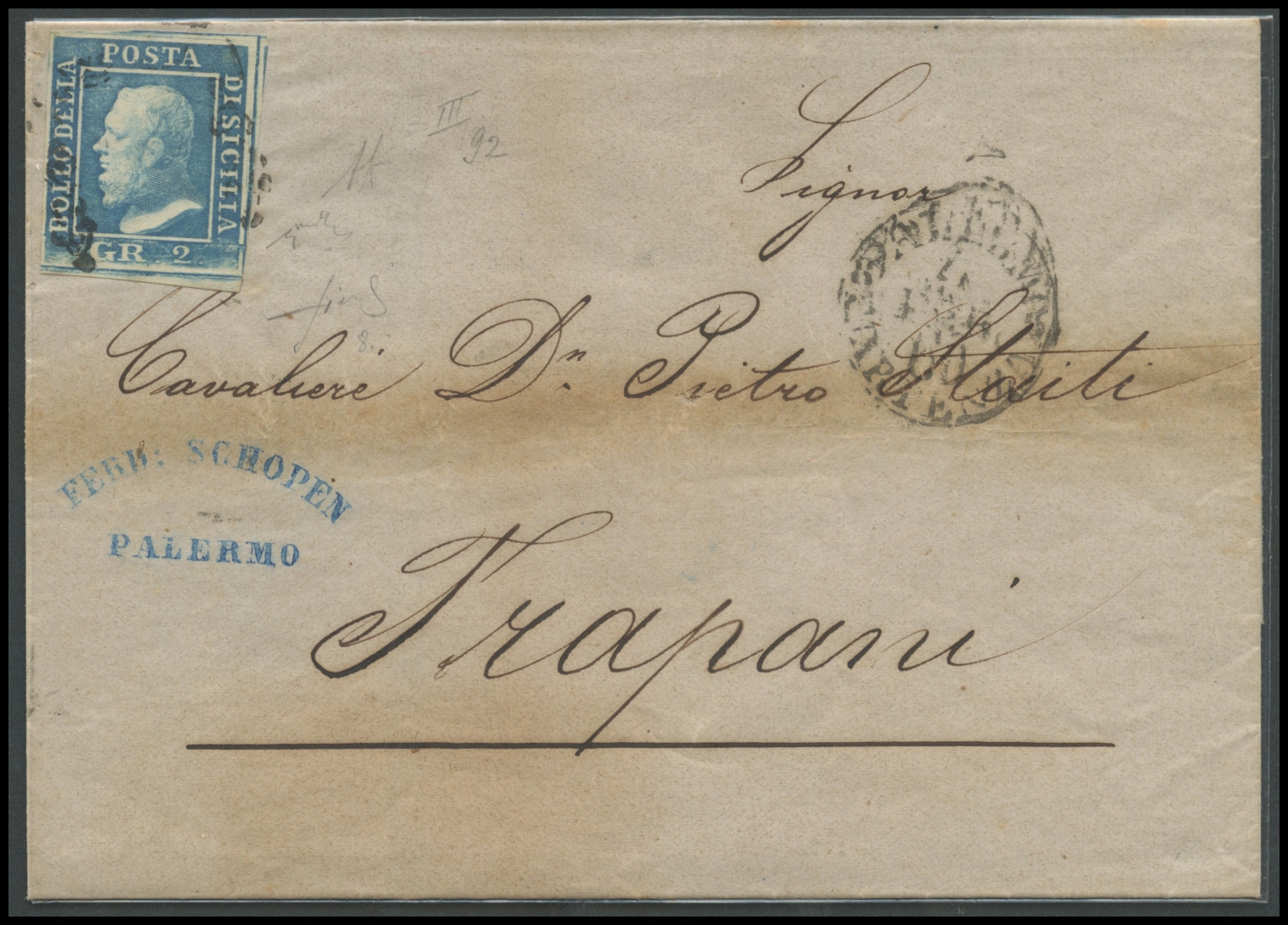 Sicily, 4.2.1860, Letter from Palermo to Trapani posted with a 2gr. Light Blue N.8. (A+) (A.Diena, Chiavarello)
