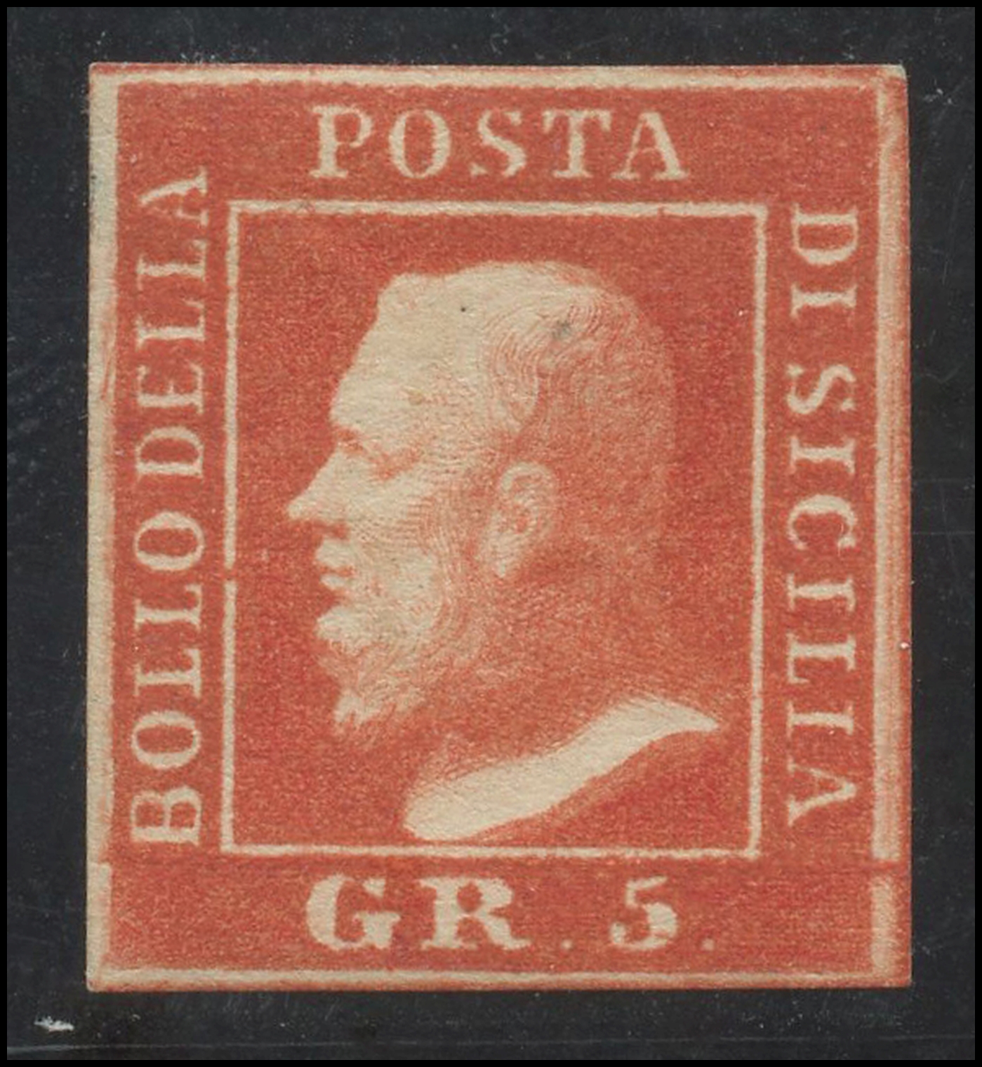 Sicily, 1859, 5gr. N.11a, bright vermillion of a particularly rich and intense shade, signed A. Diena, Em. Diena. High-quality. MH.