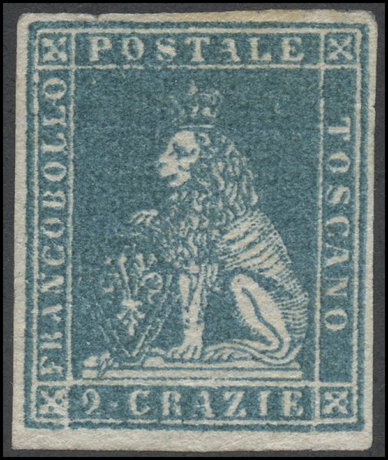 Tuscany, 1851, 2cr. Greenish Light Blue N.5e new (MH). Features noteworthy...