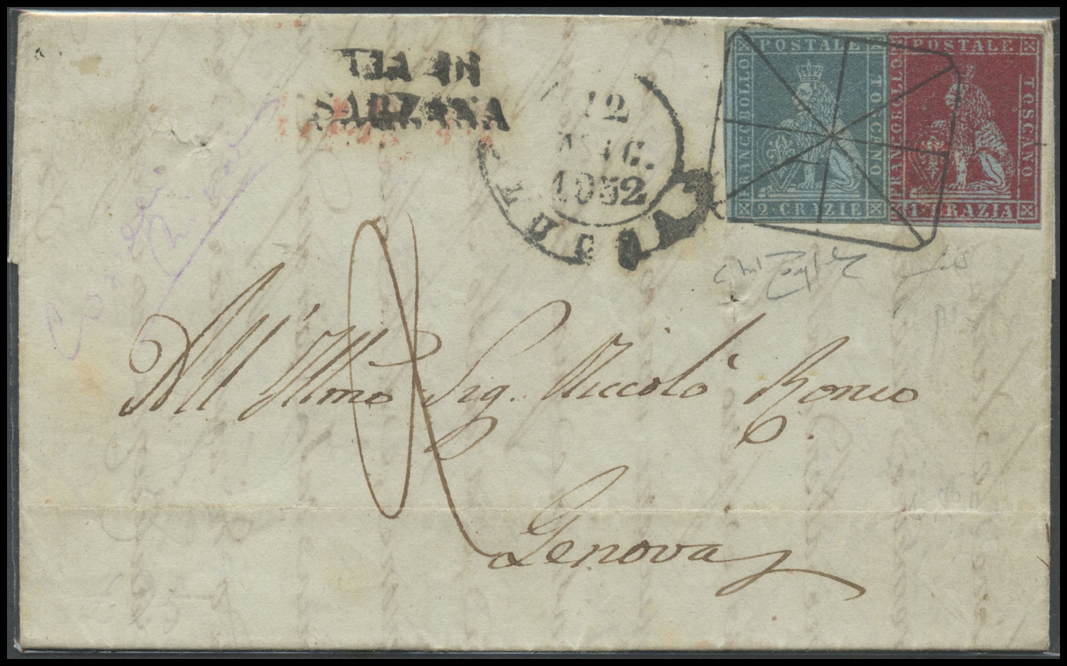 Tuscany, 12.05.1852, Letter from Lucca to Genoa posted with 3cr. using a 1cr N.4b Carmine on Light Blue, 2cr. N.5a Light Blue Grey on Light Blue. The postage features a mute cancel shaped like Lucca's spider. (10pt.). (A+) (Cert. Raybaudi)