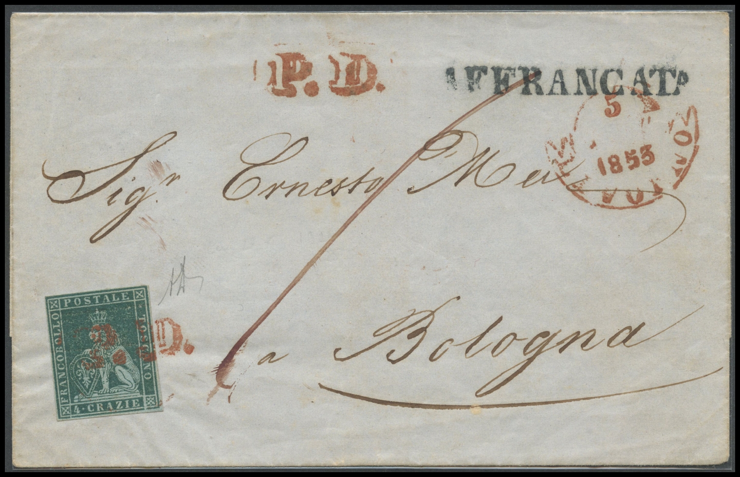 Tuscany, 05.09.1853, Letter from Livorno to Bologna posted with a 4cr. N.6a...