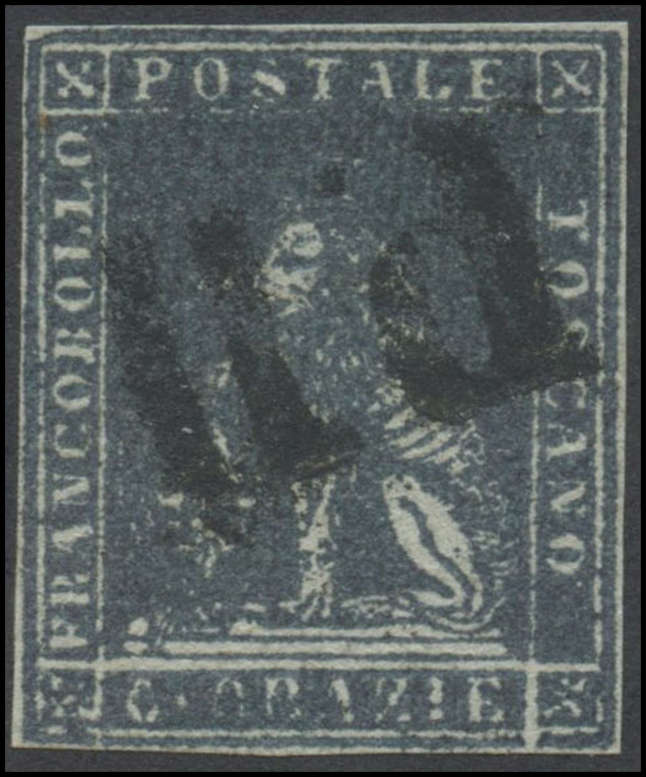Previous Lot 183 Next Bertolami Fine Art - Piazza Lovatelli 1, 00186 Roma FILATELIA ASTA WEB 239: FILATELIA Thursday 10 November 2022 hours 14:00 (UTC +01:00) Tuscany, 1851, 6cr. N. 7f Dark Grey on Grey, used (A) Tuscany, 1851, 6cr. N. 7f Dark Grey on Grey, used (A)