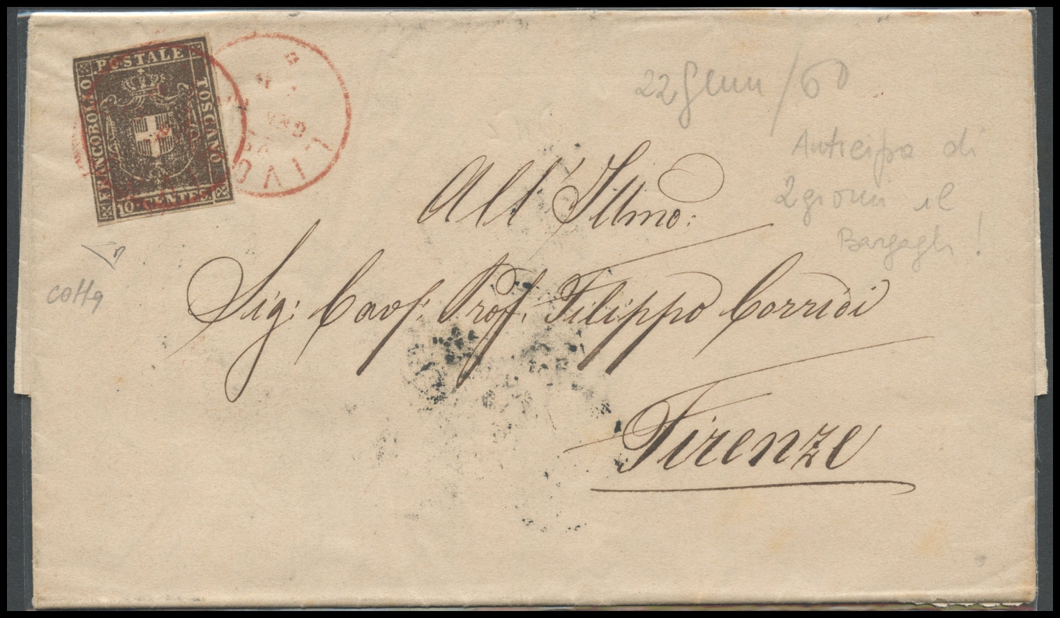 Tuscany, 22.01.1860, Letter from Livorno to Florence posted with a 10c. N.19 Tawny. On the postage Livorno's simple red circle, showing a date 2 days earlier than the first known date from Bargagli. (A) (Cert. En. Diena, Cert. Colla)