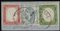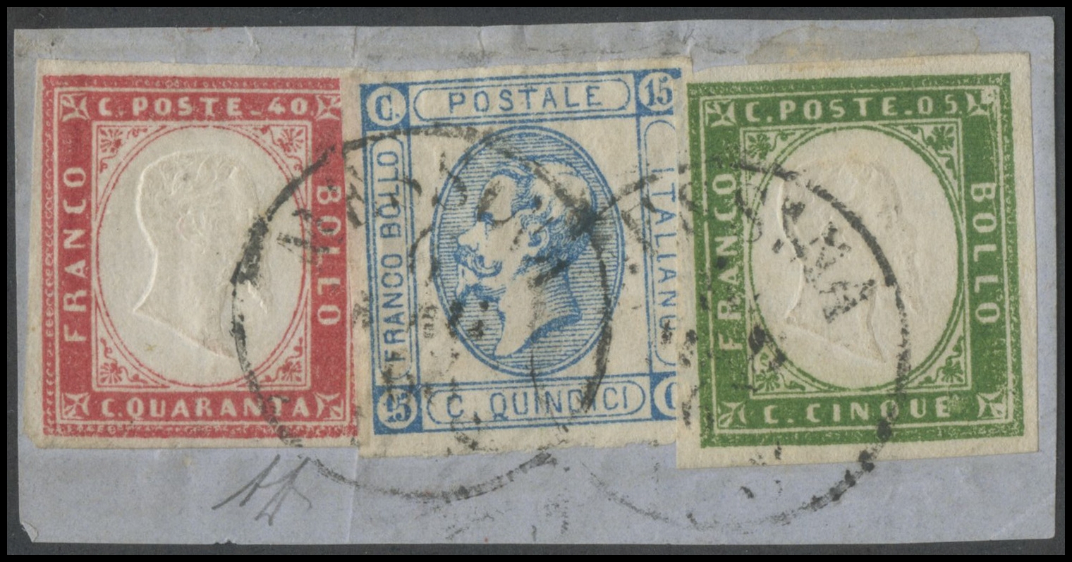 Sardinia, "Patriotic" fragment with the Italian flag's tricolour, mixed Sardinia/Italy Kingdom composed by a 40c. N16F vermillion Pink, 15c. N.12 Light Blue and a 40c. 5c. N13Da Yellowish Green. (A+)