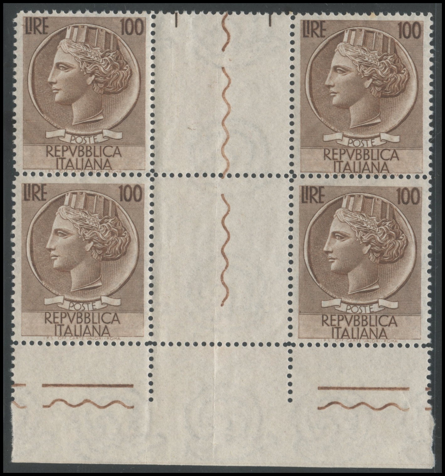 Republic, 1954, 100L. and 200L. ''Italia turrita'' N.747/748 in gorgeous blocks with inter-sheet gap and margin on the bottom. MNH.
