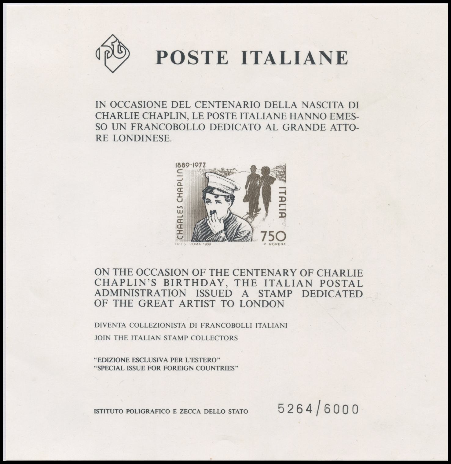 Republic, Promotional souvenir sheets, N.2 "Chaplin". High quality. "Italia...