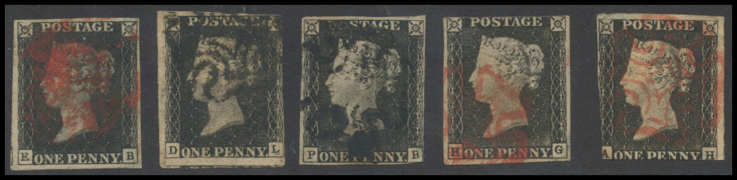 Great Britain, 1840, "Penny Black", 5 stamps of mixed quality.