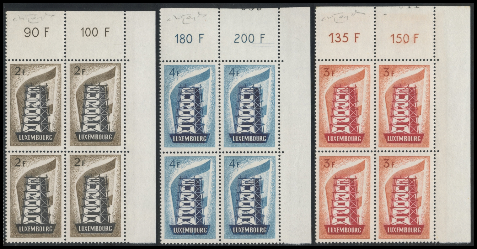 Luxembourg, 1956, N.514/516. Splendid new blocks of four from sheet corners....