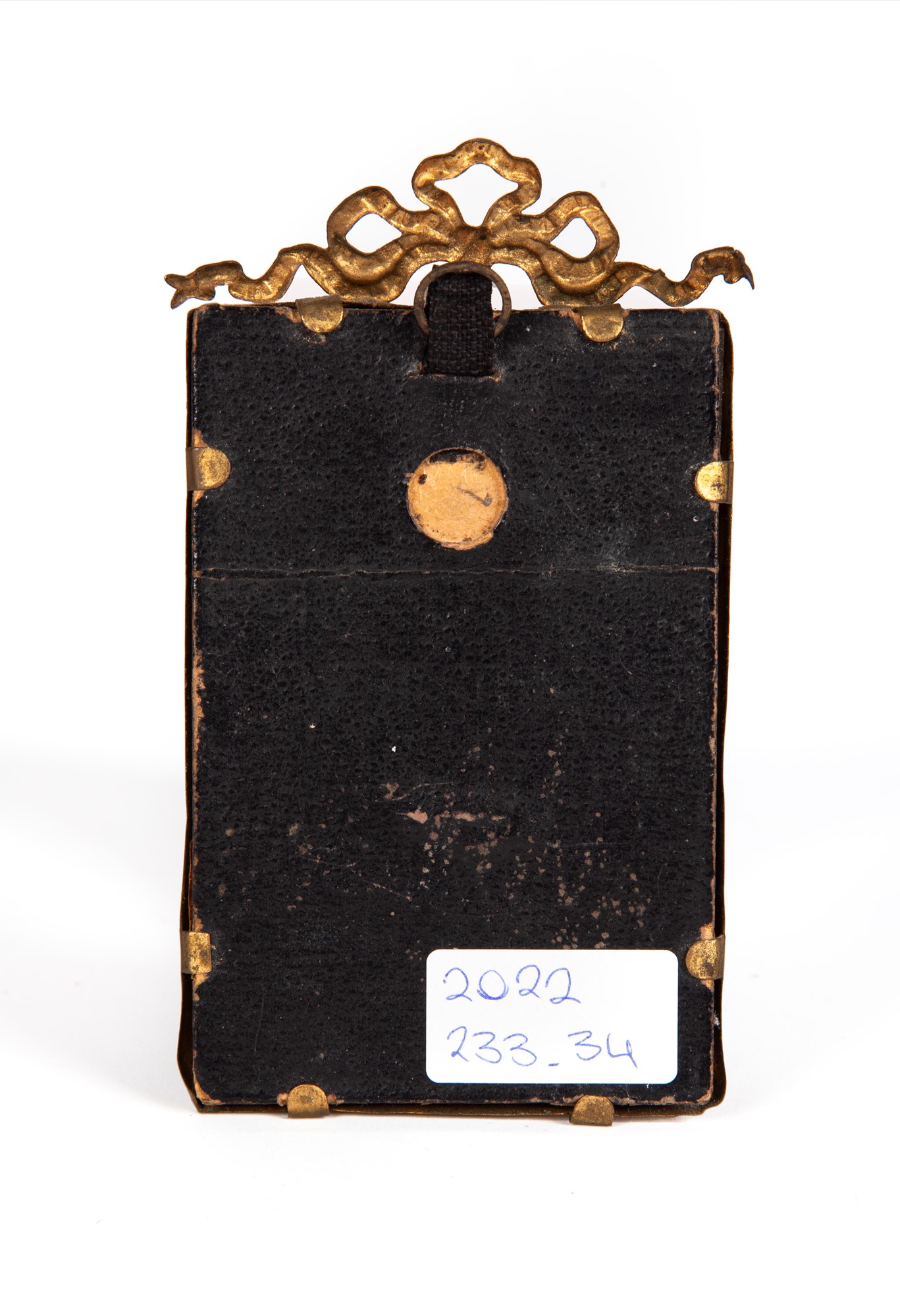 entro cornice in lamina di metallo dorato con fiocco sulla sommità