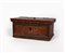 decorata a volute vegetali in verde e crema su fondo rosso; specchiature racchiuse da cornici modanate, coperchio con profilo a dentelli