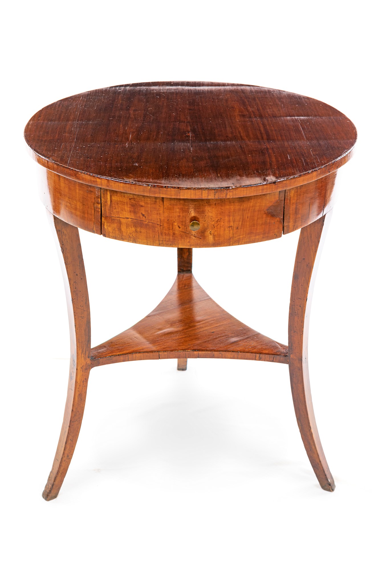 con piano circolare, un cassetto nella fascia, gambe a sciabola riunite da un piano triangolare