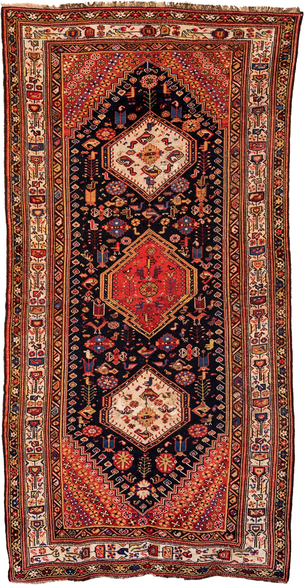 con tre medaglioni esagonali bianchi e rosso, circondati da motivi floreali e uccellini sparsi sull'intera superficie; cantonali rossi, molteplici bordure