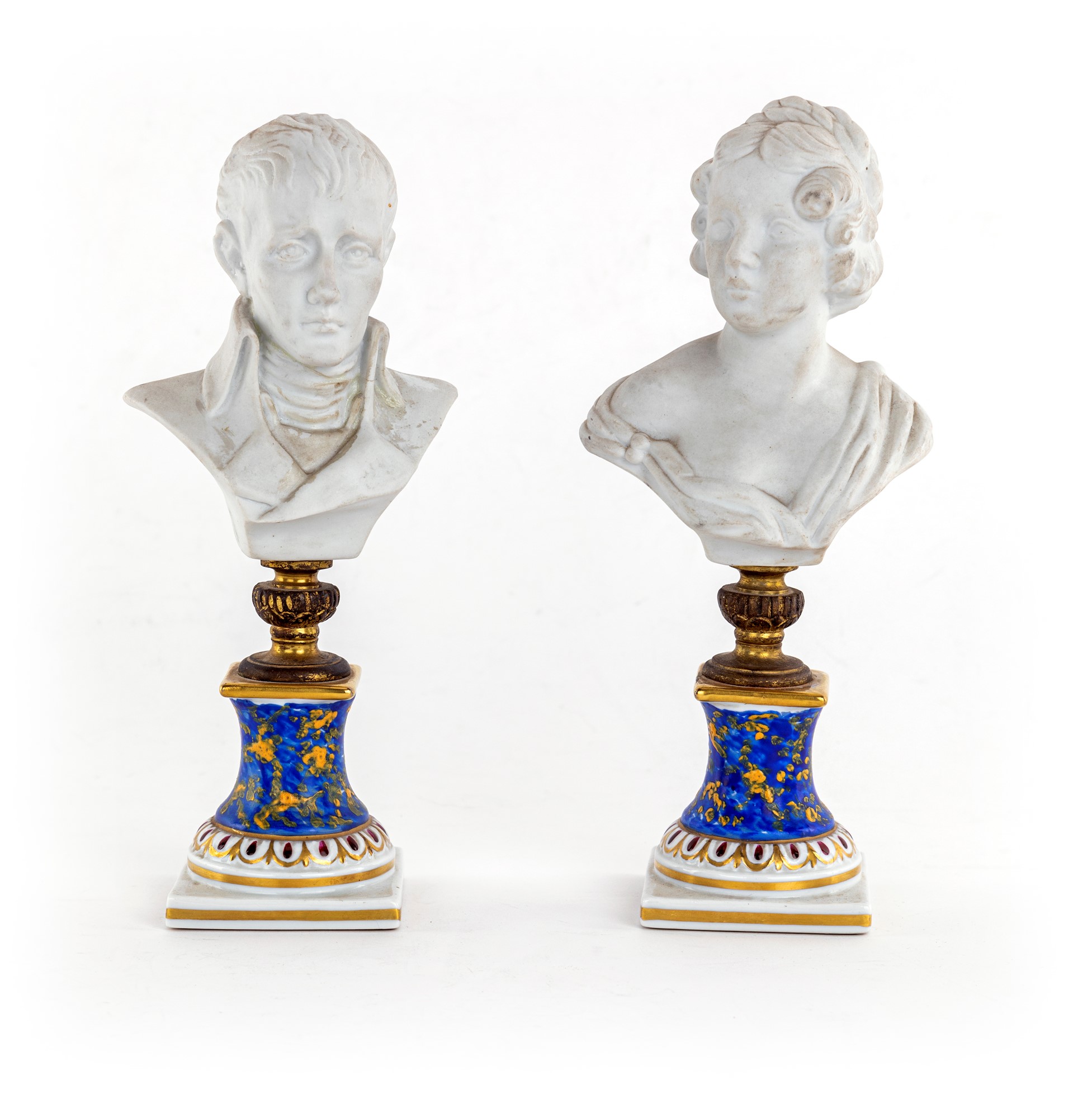 raffiguranti Napoleone Primo Console e una giovane Maria Antonietta, da Louis-Simon Boizot. Piedistalli in bronzo su basi a rocchetto in porcellana dipinta e dorata