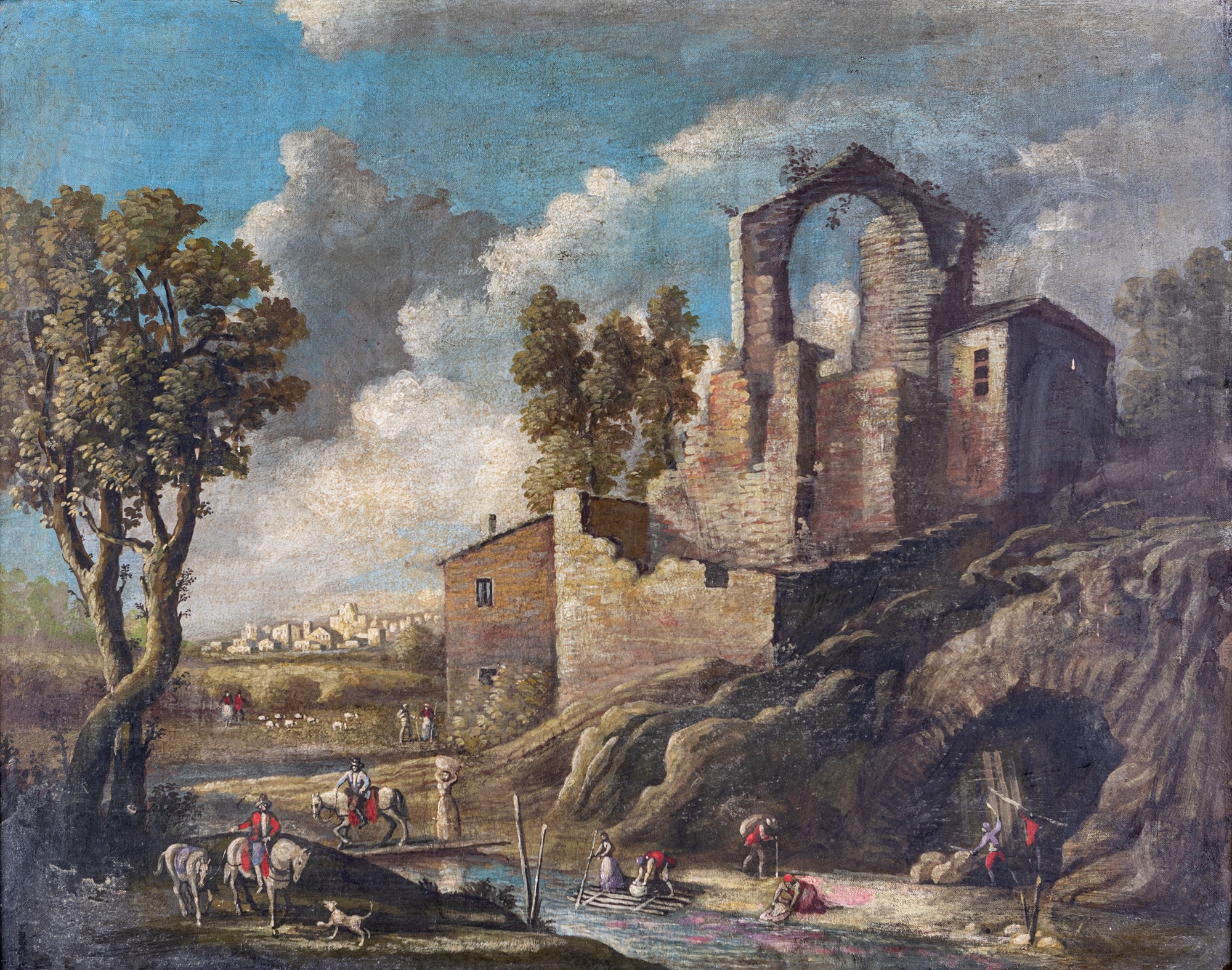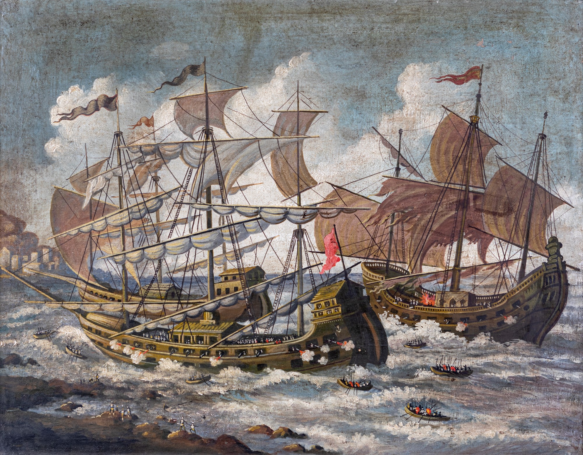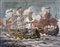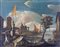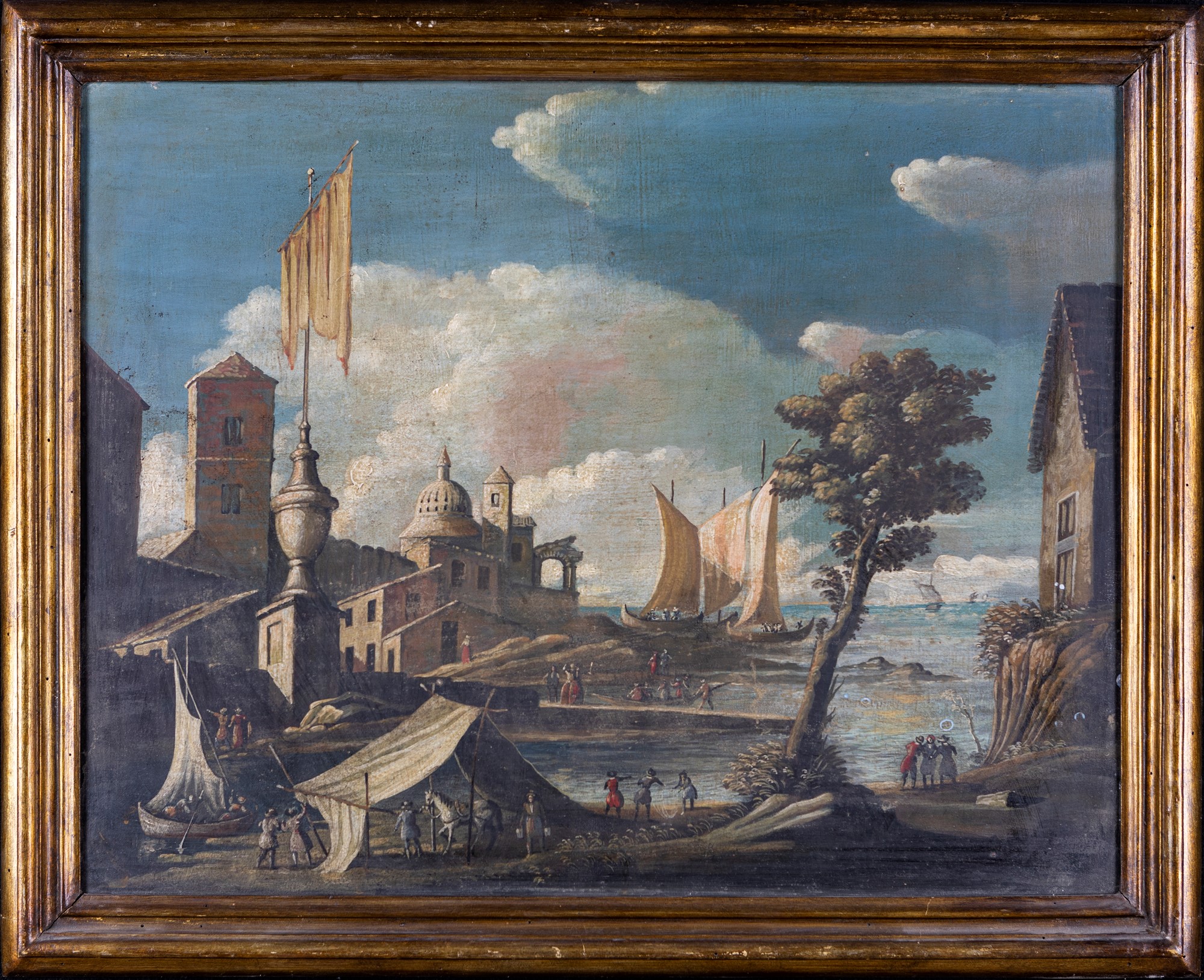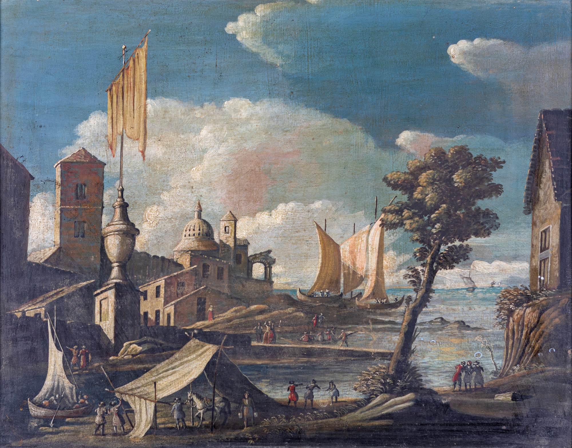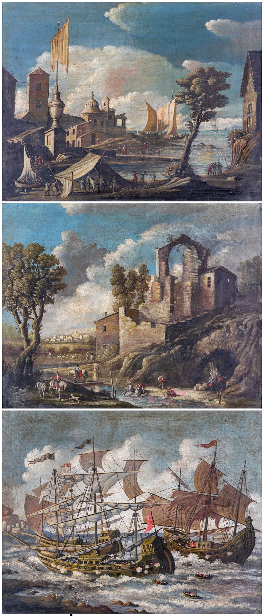 a) Veduta campestre b) Veduta di città portuale c) Marina con battaglia navale